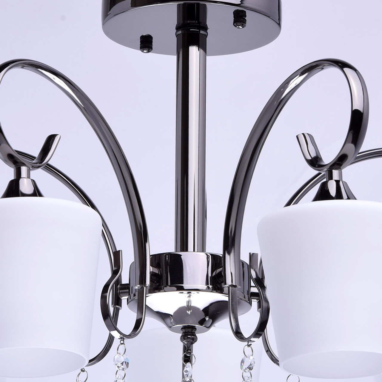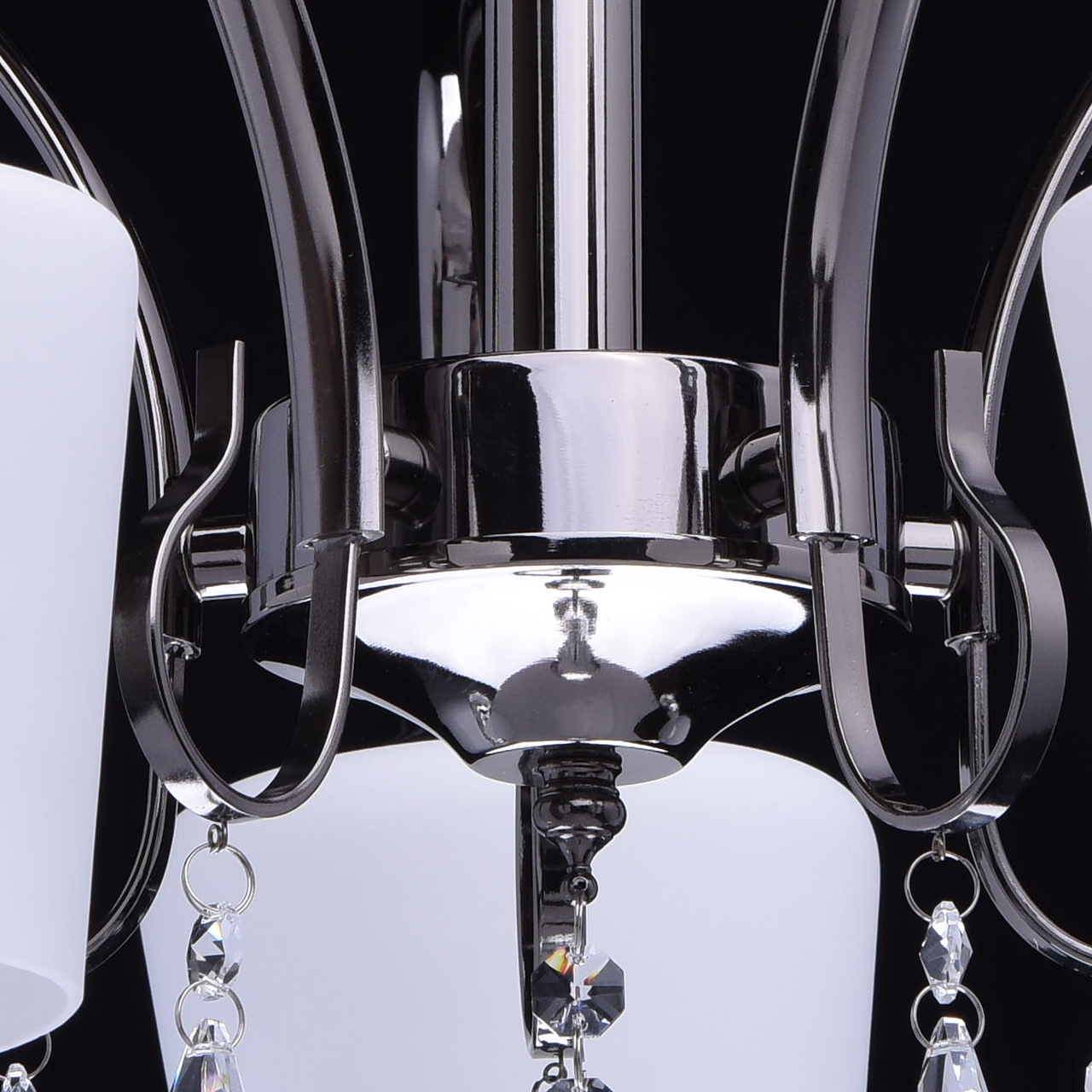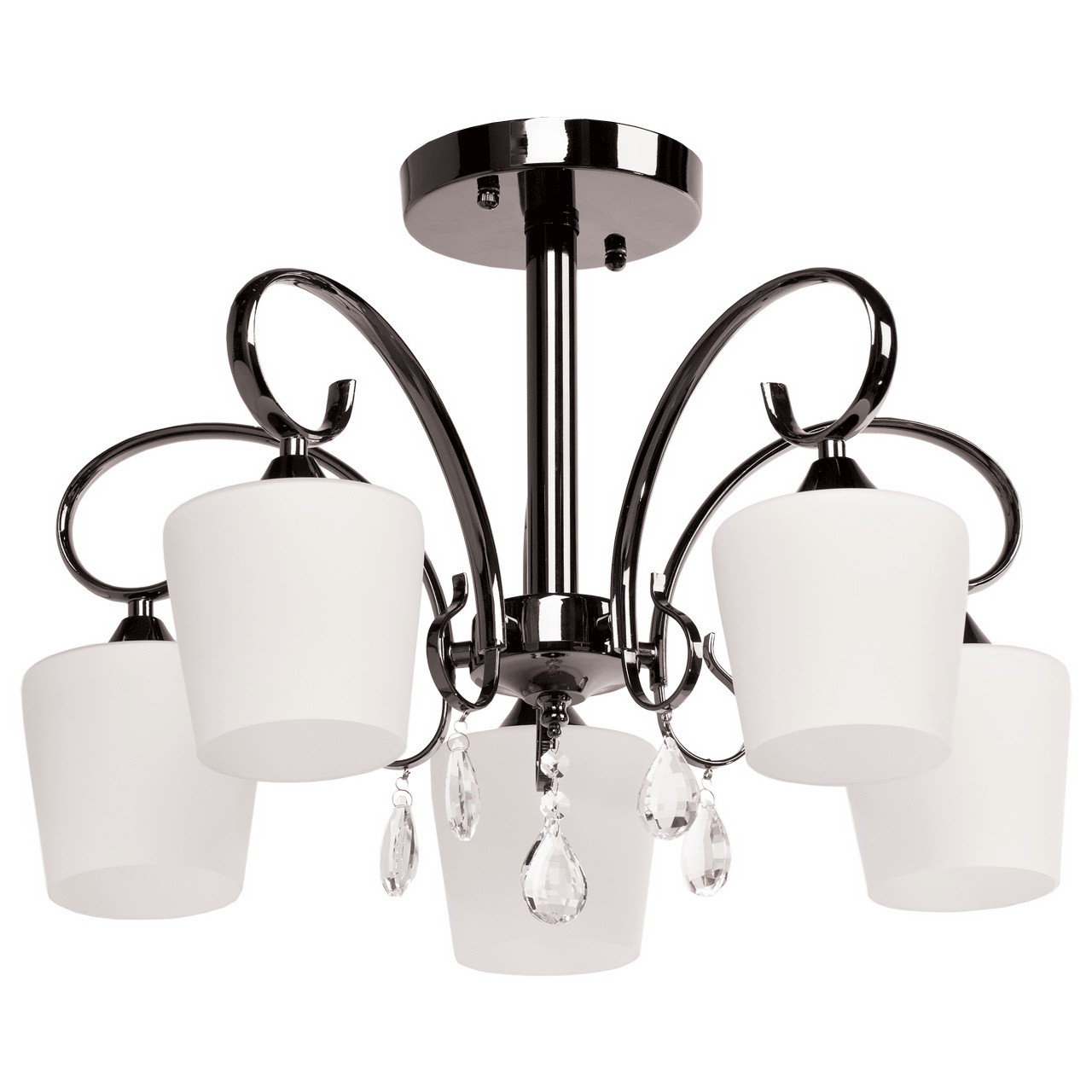 Ciekawa kombinacja czarnej, niklowanej bazy i białych, matowych kloszy. Jako ozdobiniki zastosowano kryształ. Lampa w bardzo przystępnej cenie. Model jest idealny do mieszkań miejskich ze standardowymi sufitami.