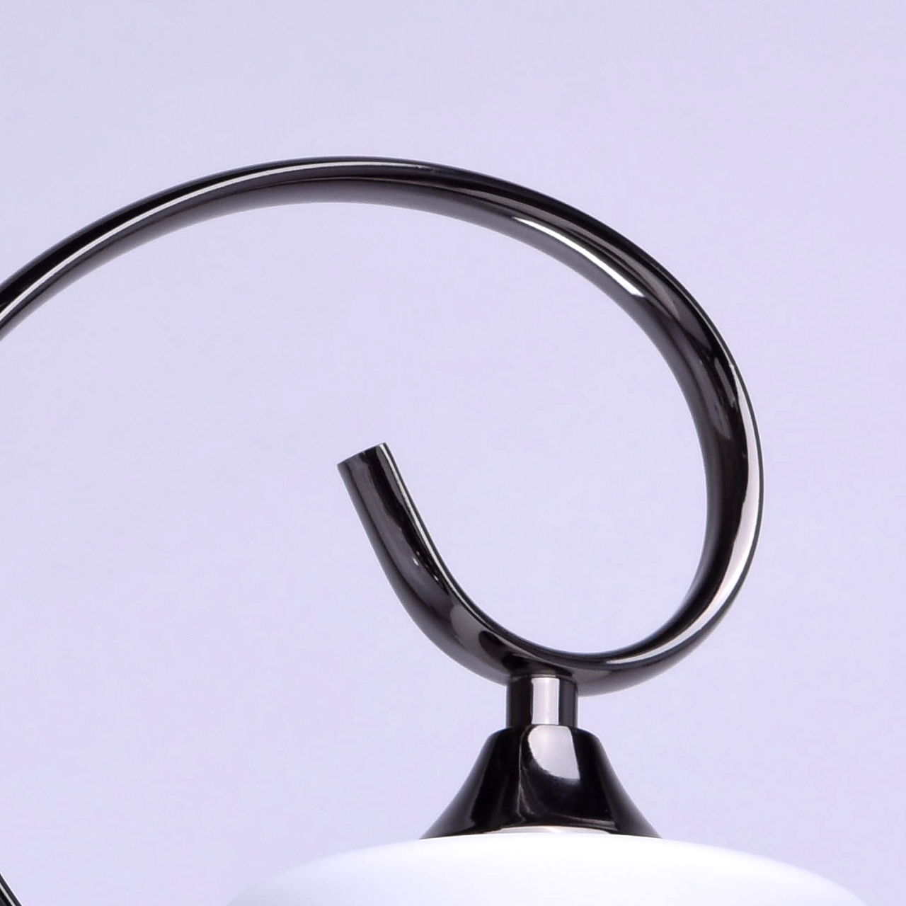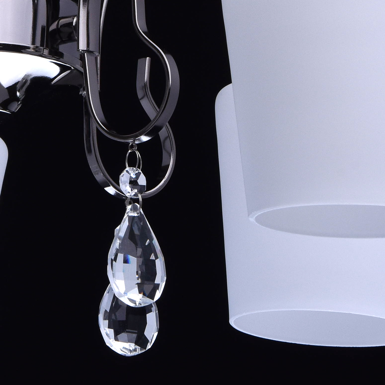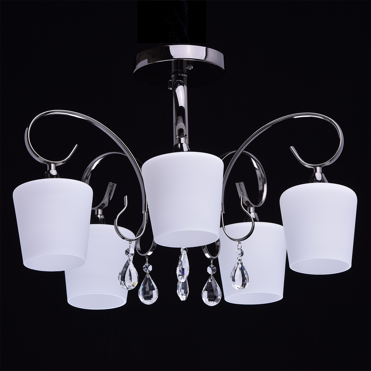 Ciekawa kombinacja czarnej, niklowanej bazy i białych, matowych kloszy. Jako ozdobiniki zastosowano kryształ. Lampa w bardzo przystępnej cenie. Model jest idealny do mieszkań miejskich ze standardowymi sufitami.