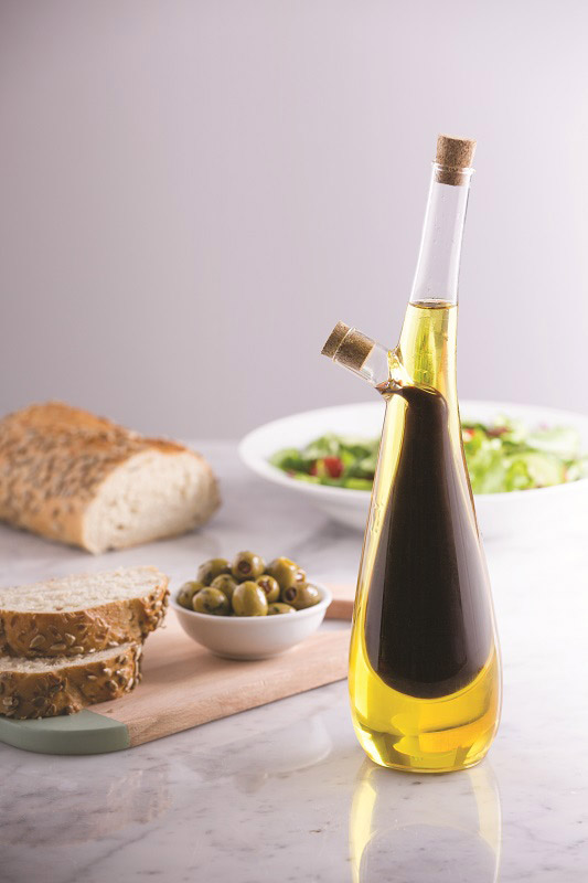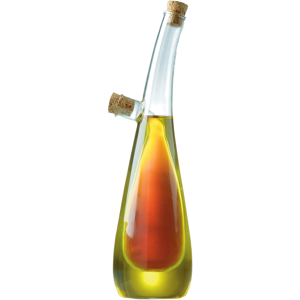Smukła i elegancka butelka do oliwy lub octu Seasonings marki Typhoon o pojemności 0,35 Litra. Oryginalna forma dozownika, łącząca dwa naczynia: butelkę na oliwę o pojemności 0,25 Litra oraz pojemnik na ocet o pojemności 0,1 Litra. Wyposażona w dwie szyjki, które pozwalają dozować przyprawy niezależnie od siebie. Obie szyjki, zamknięte są zatyczkami z korka. Butelka ma szeroką, stabilną podstawę. Przezroczyste ścianki pozwalają wyeksponować zawartość i jednocześnie kontrolować jej poziom.
