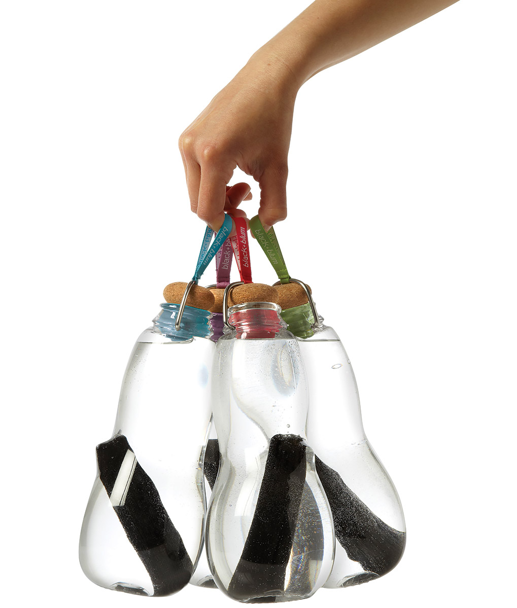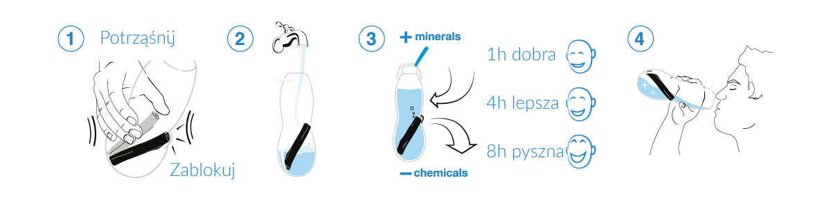 Butelka na wodę z filtrem węglowym Eau Good marki Black Blum. Rozwiązanie wykorzystuje, tradycyjny, japoński węgiel Binchōtan, dzięki któremu zwykła woda z kranu smakuje wyśmienicie. Celem projektantów było stworzenie kształtu butelki, który nawiązywał do starych, wiktoriańskich butelek, a jednocześnie był nowoczesny. Dlatego też użyto w butelce naturalny korek oraz drut blokujący ze stali nierdzewnej. Producent nie chciał użyć do produkcji szkła, z uwagi na jego kruchość, dlatego użyto nowoczesnego materiału - Tritanu, który ma podobną atrakcyjność wizualną. Przy projekcie kształtu butelki istotne było załamawymanie się światła w wodzie, które ma swoje piękno. Dodatkowo istotna była minimalistyczna forma - brak dodatkowych elementów oraz możliwość zablokowania wewnątrz butelki węglowego filtra. Co roku na świecie wyrzucanych jest 22 miliardy butelek z tworzywa sztucznego. Dlatego marka black+blum dąży do zredukowania tych nieekologicznych zachowań i zachęca do picia wody z kranu, która smakuje lepiej. Zachęcamy do zaprzestania kupowania wody w butelkach. Jak działa nasz butelka? Wypełnij wodą (pitną) z kranu butelkę, poczekaj, aż filtr węglowy ją oczyści z zanieczyszczeń chemicznych, spróbuj różnicę po zaledwie jednej godzinie. Ciesz się degustacją pysznej wody! Użytkowanie filtra węglowego: jeżeli używasz filtra dołączonego do butelki codziennie, to powinien Ci wystarczyć na trzy miesiące. Jego regeneracja polega na gotowaniu go przez 10 minut i pozostawieniu do wyschnięcia, najlepiej na słońcu. Po trzech takich procesach filtr należy wymienić na nowy. Filtry węglowe Binchōtan stosowane są w Japonii do oczyszczania wody od XVII wieku. Redukują one, chlor i inne zanieczyszczenia, a uwalniają m.in. żelazo, wapń i magnez. Równoważą też pH wody. Do butelki należy wlewać tylko chłodną wodę. Drobiny węgla pływające w wodzie nie są toksyczne i nie stanowią przeszkody w jej spożywaniu. Butelka przeznaczona wyłącznie do pitnej wody kranowej – nie używać do wody ze źródeł zewnętrznych (rzek, jezior itp.), do wód smakowych ani do soków. Należy zapobiegać pleśnieniu korka – jeżeli butelka nie jest używana dłużej niż 1 dzień, należy zostawić ją otwartą do następnego użycia, silikonowe zakończenie korka dezynfekować sokiem z cytryny, a następnie sparzyć (tak, by nie zalać góry korka). Nie pić filtrowanej wody starszej niż 1 dzień.