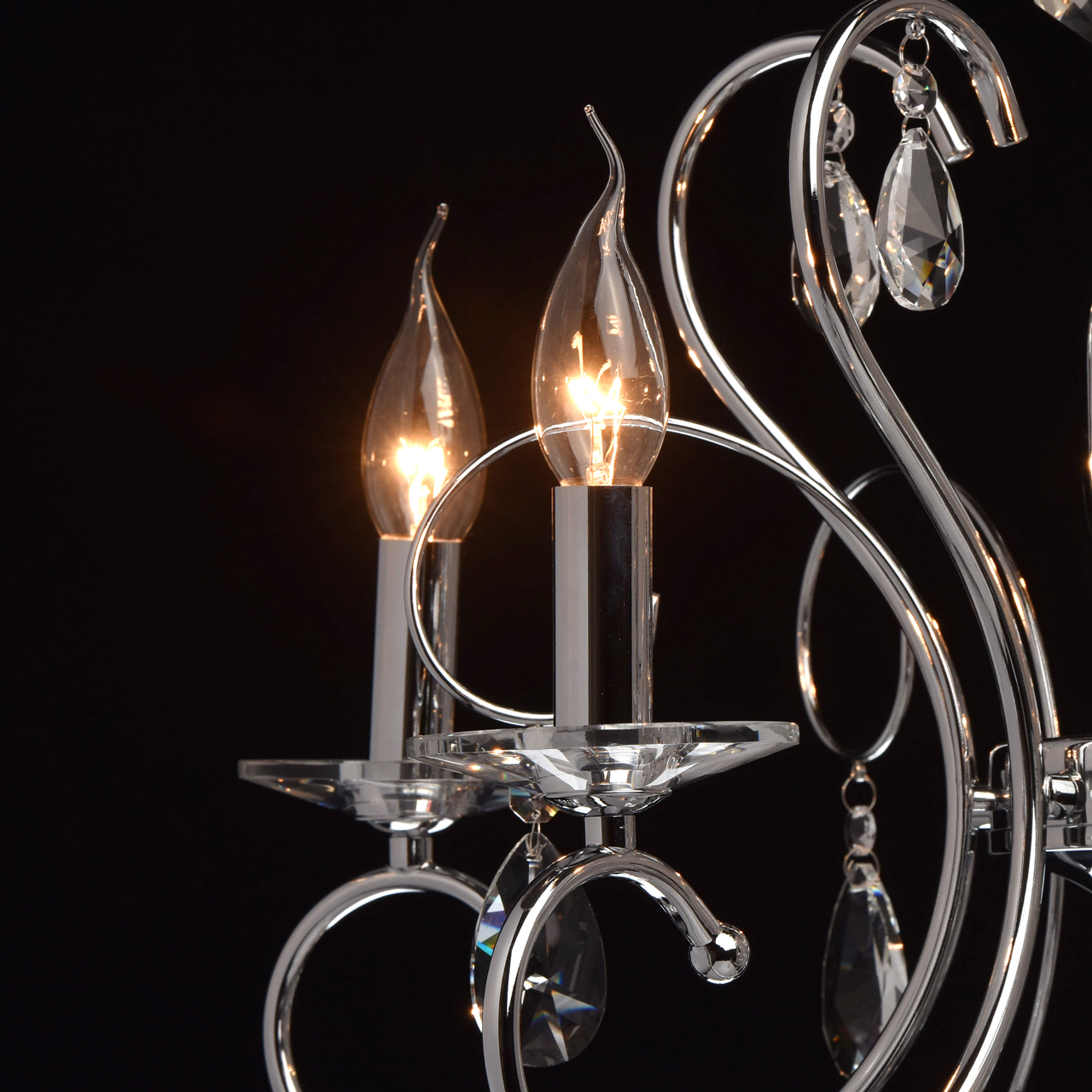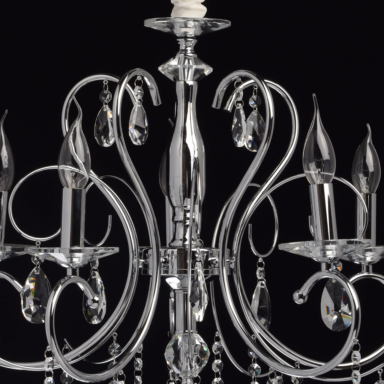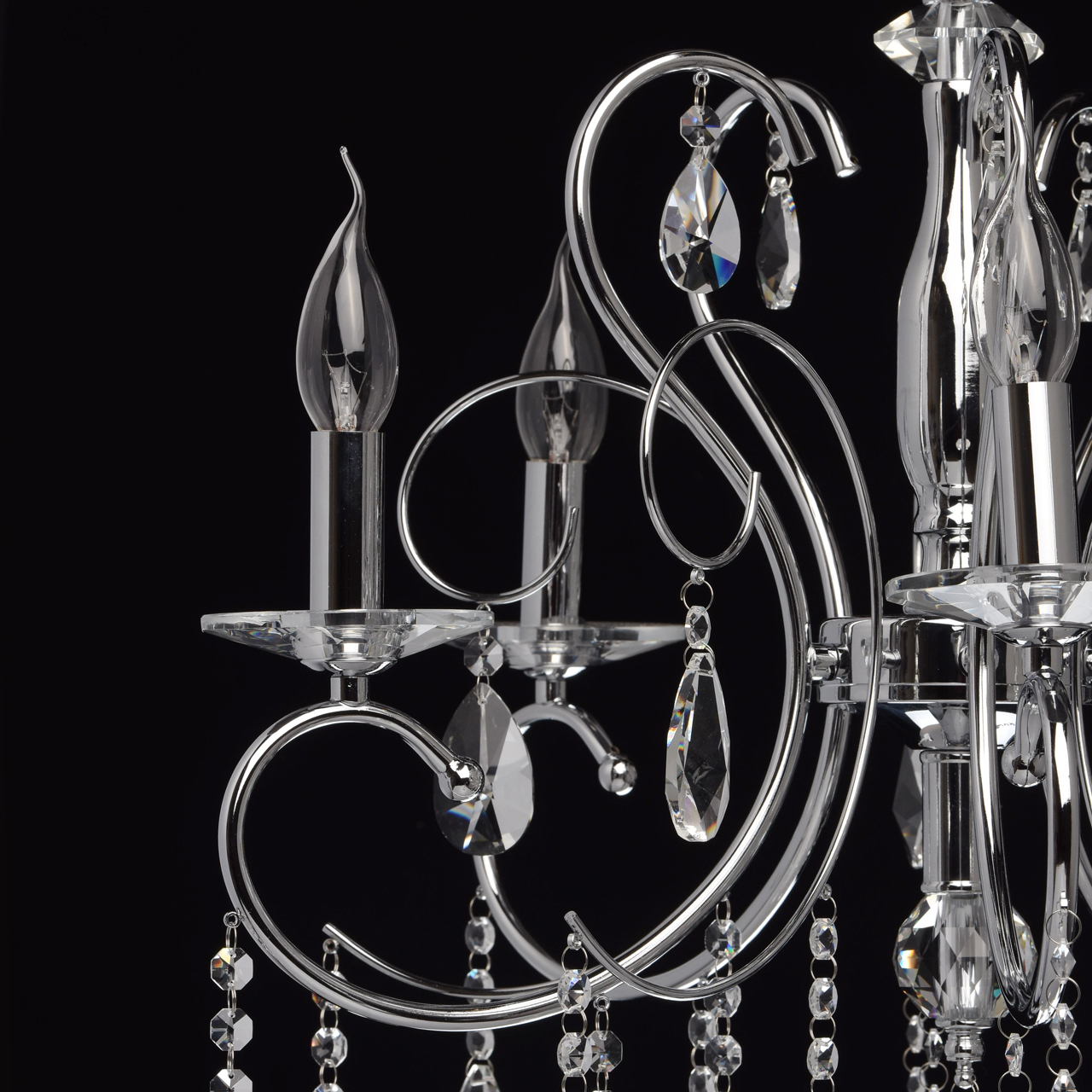 Projekt w klasycznym stylu. Tradycyjny kształt żarówek - świec zapewnia dużo oświetlenia. Przezroczyste wisiorki kryształowe tworzą magiczną grę światła, a żyrandol wyróżnia się wyjątkową elegancją dzięki cienkim, zakrzywionym rogom w kolorze chromu. Obecność kilku lamp w rodzinie Adele, pozwala na kompleksowe oświetlenie pokoju.