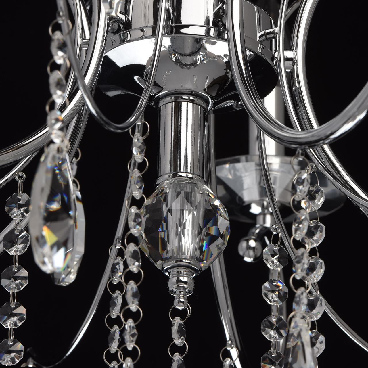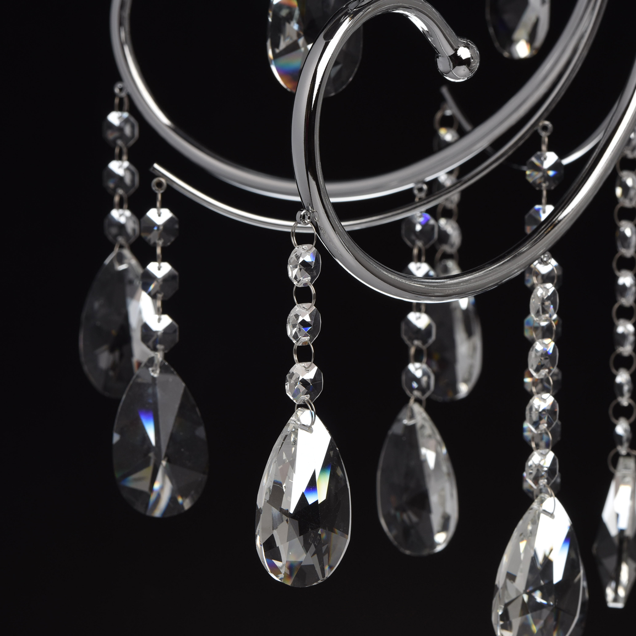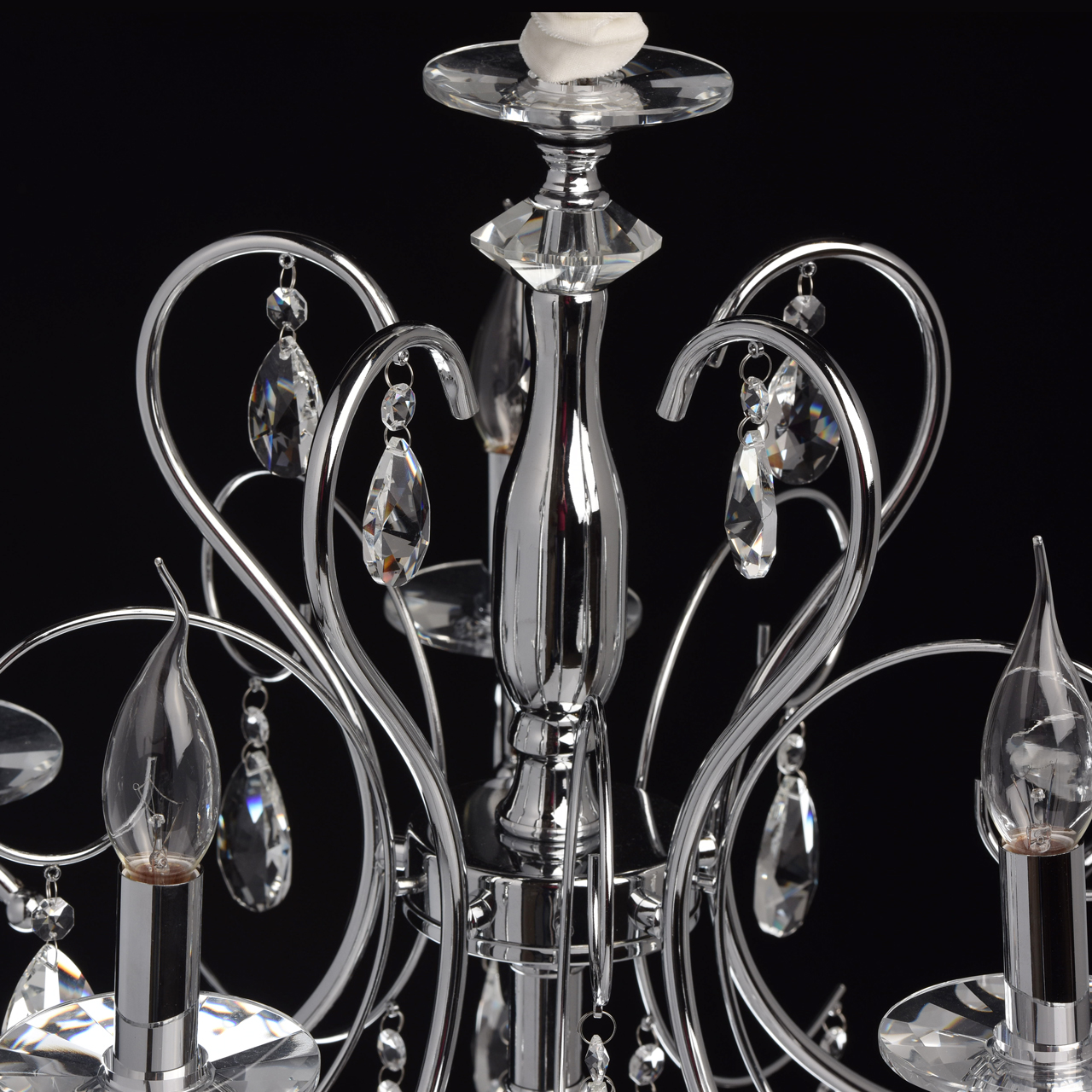 Podstawa: metalowa, ocynkowana w kolorze chromu. Ramiona i elementy dekoracyjne wykonane są metodą walcowania na maszynie rolkowej. Oś środkowa jest ozdobiona tablicami kryształu o złożonym cięciu. Dekoracyjne rozety wykonane z litego kryształu. Lampa ozdobiona jest wisiorkami z wysokiej jakości kryształu ośmiokąta i migdałów.
