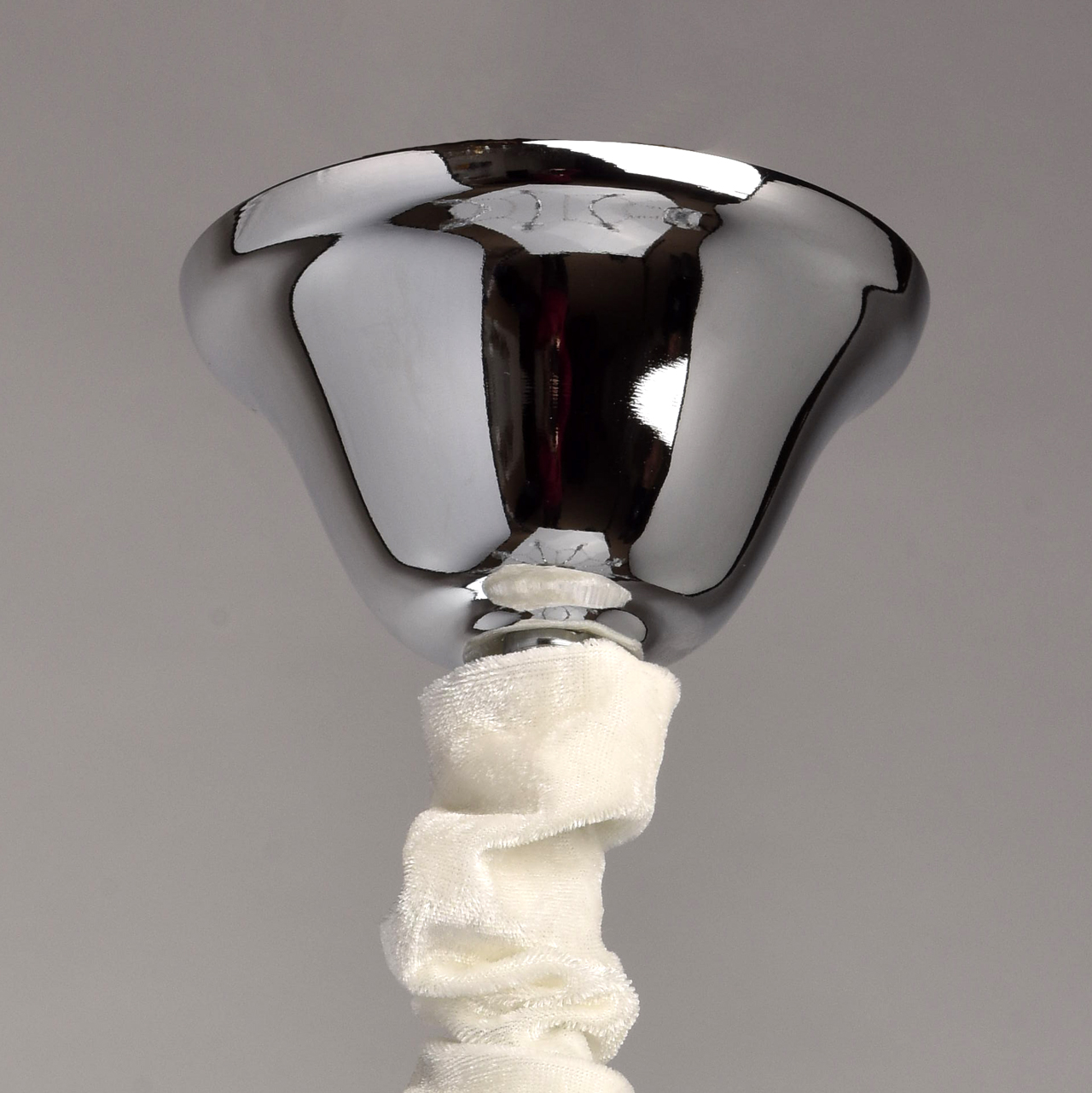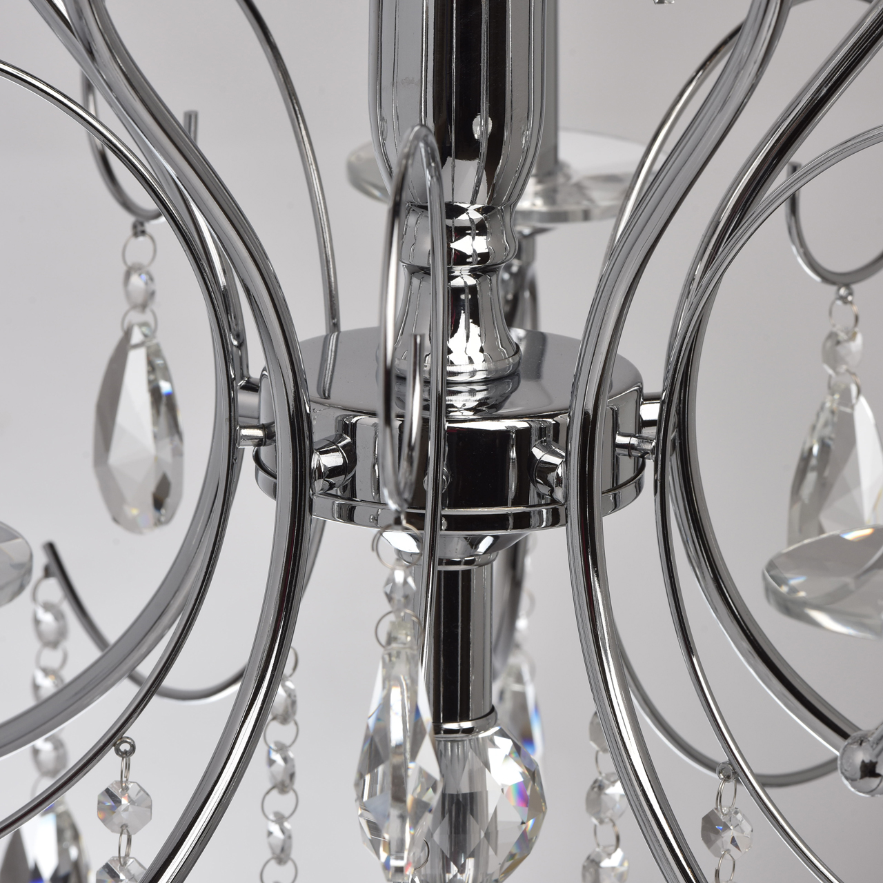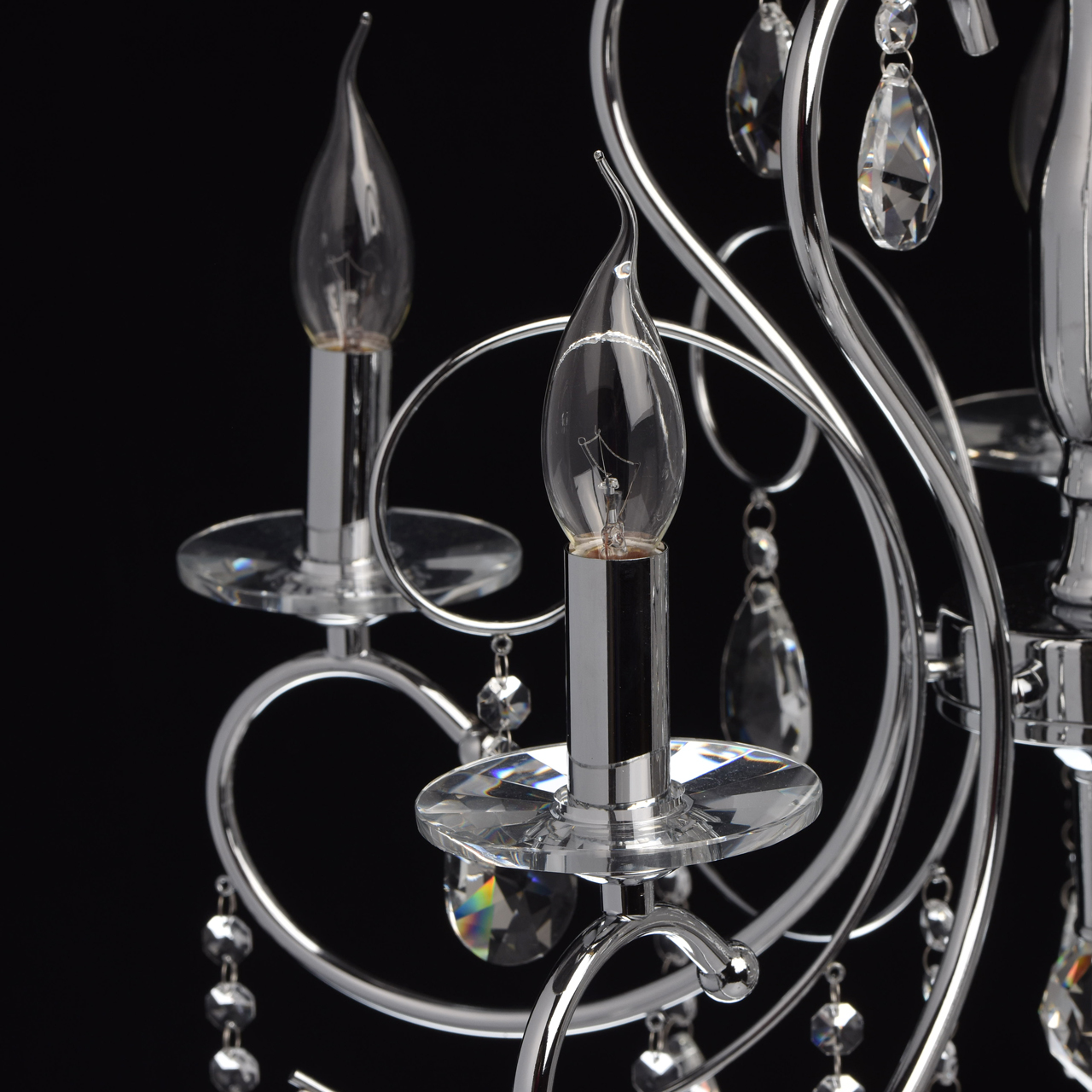 Podstawa: metalowa, ocynkowana w kolorze chromu. Ramiona i elementy dekoracyjne wykonane są metodą walcowania na maszynie rolkowej. Oś środkowa jest ozdobiona tablicami kryształu o złożonym cięciu. Dekoracyjne rozety wykonane z litego kryształu. Lampa ozdobiona jest wisiorkami z wysokiej jakości kryształu ośmiokąta i migdałów.