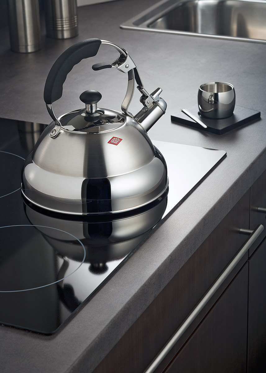 Czajnik czerwony z gwizdkiem Classic Wesco 2 Litry to bardzo elegancki styl retro, dopasowany do pozostałych produktów linii Classic. Wyposażony w silikonowe uchwyty, aby ułatwić chwytanie i zapewnić bezpieczeństwo. System zwalniania zatrzasku umożliwia łatwe napełnianie. Piękno wysokiej jakości stali nierdzewnej z kolorowymi dodatkami sprawia, że ten projekt jest wyjątkowy. Czajnik na wodę nadaje się do wykorzystania na wszystkich rodzajach kuchenek łącznie z indukcyjnymi. Klasyczny czajnik z gwizdkiem doskonale nadaje się do stylowych kuchennych wnętrz.