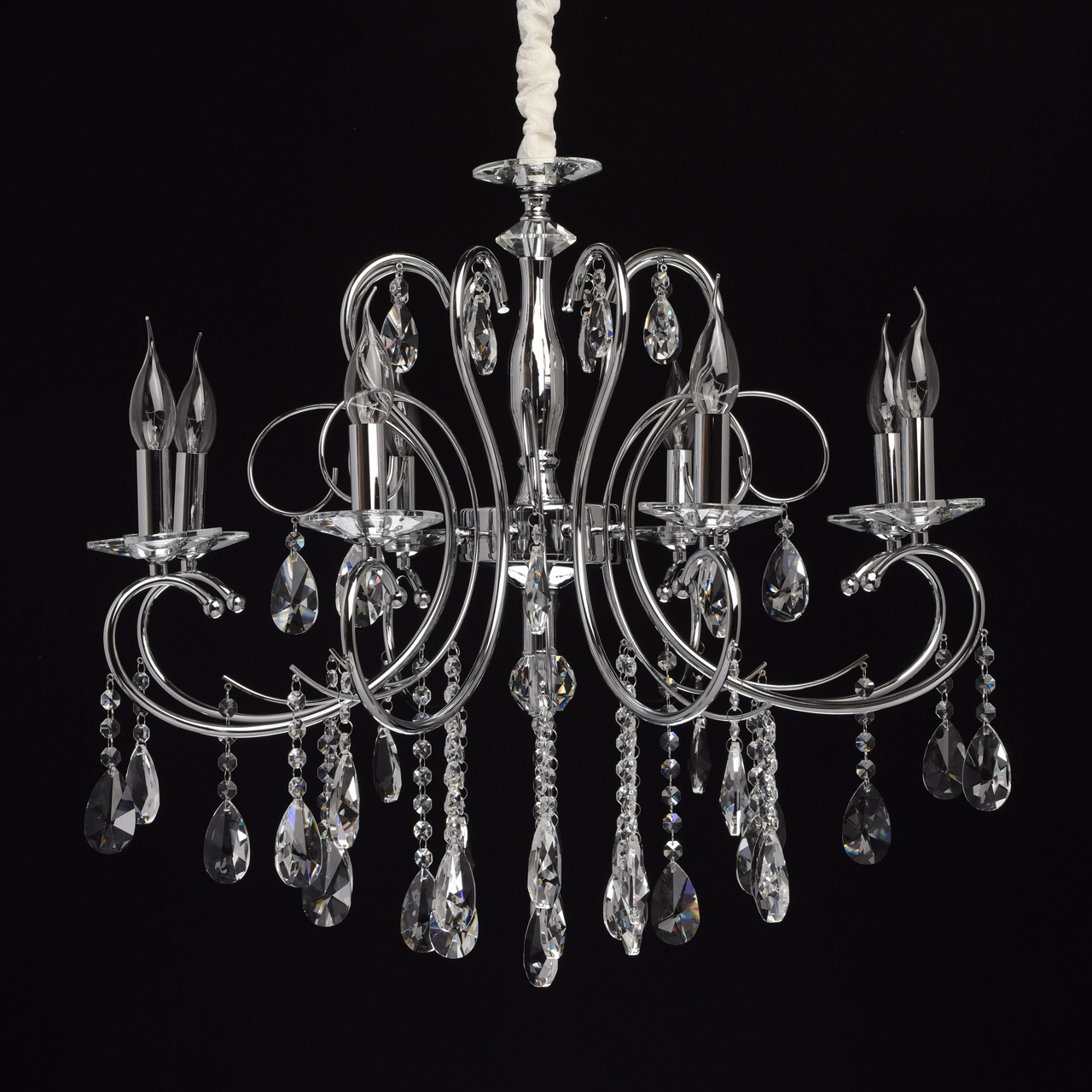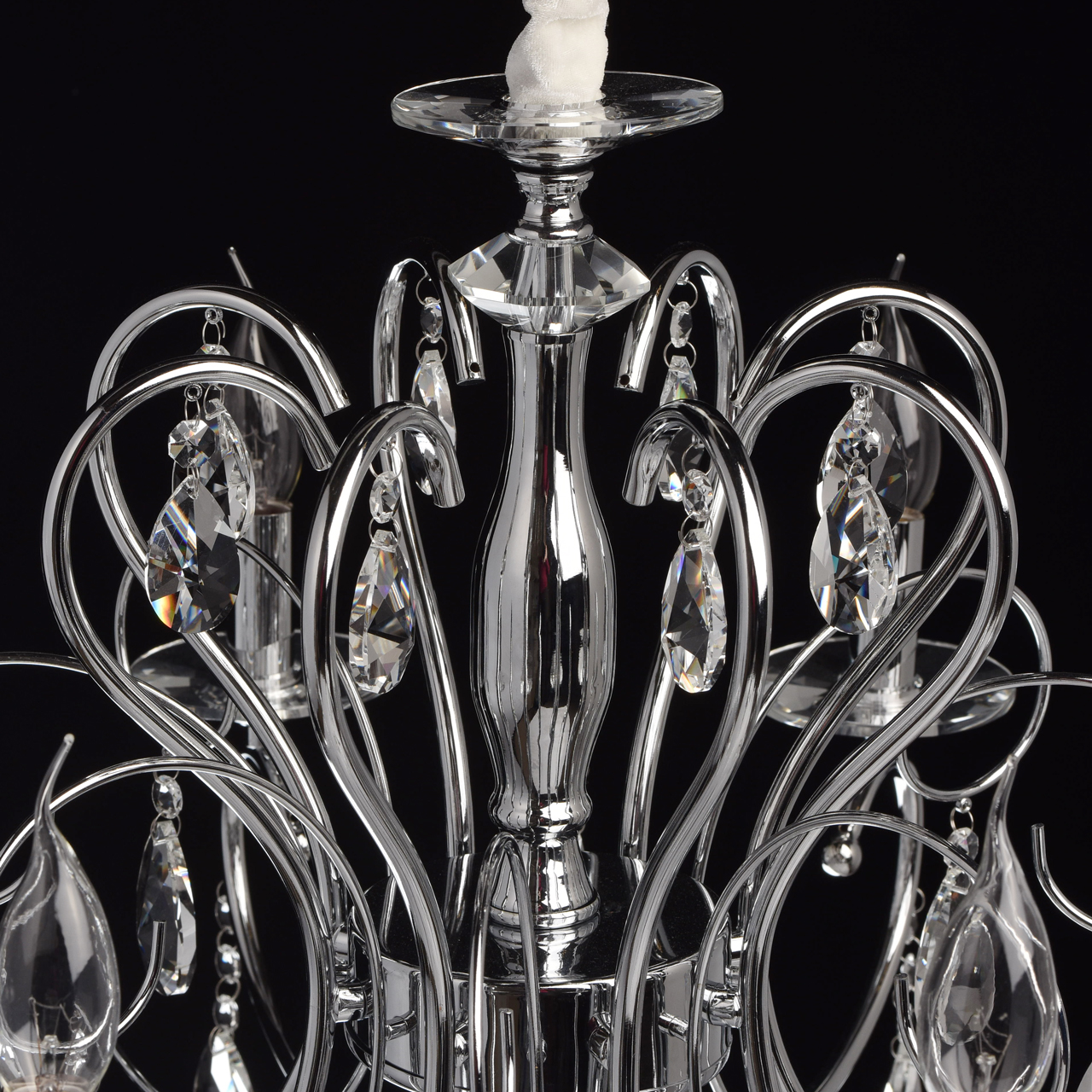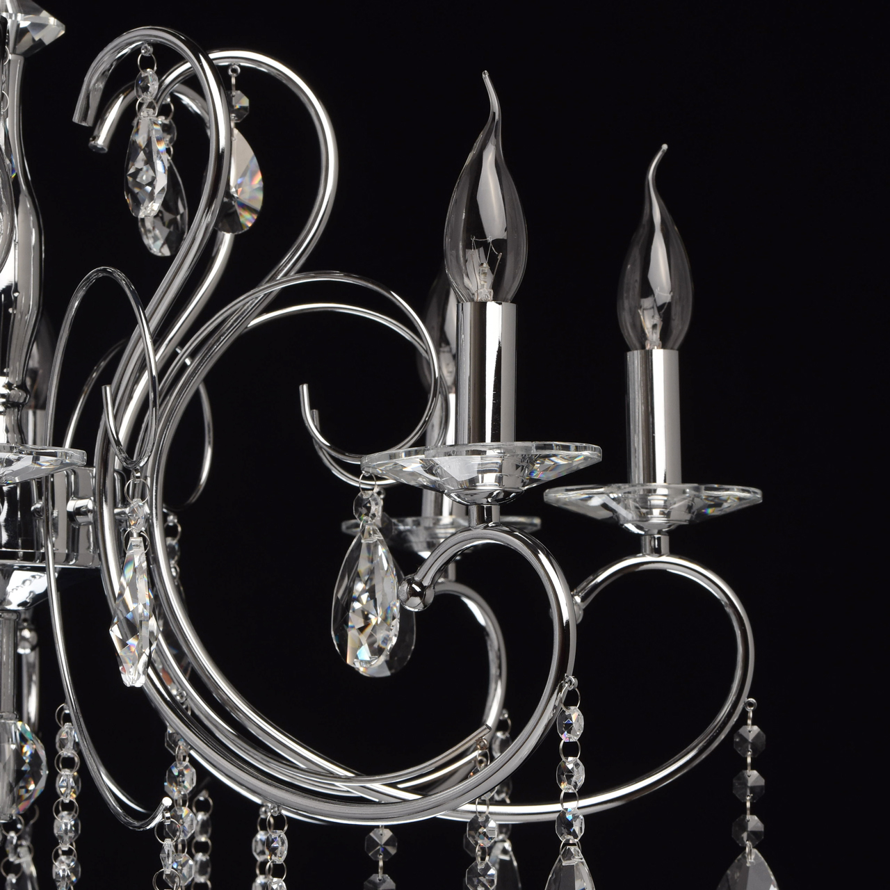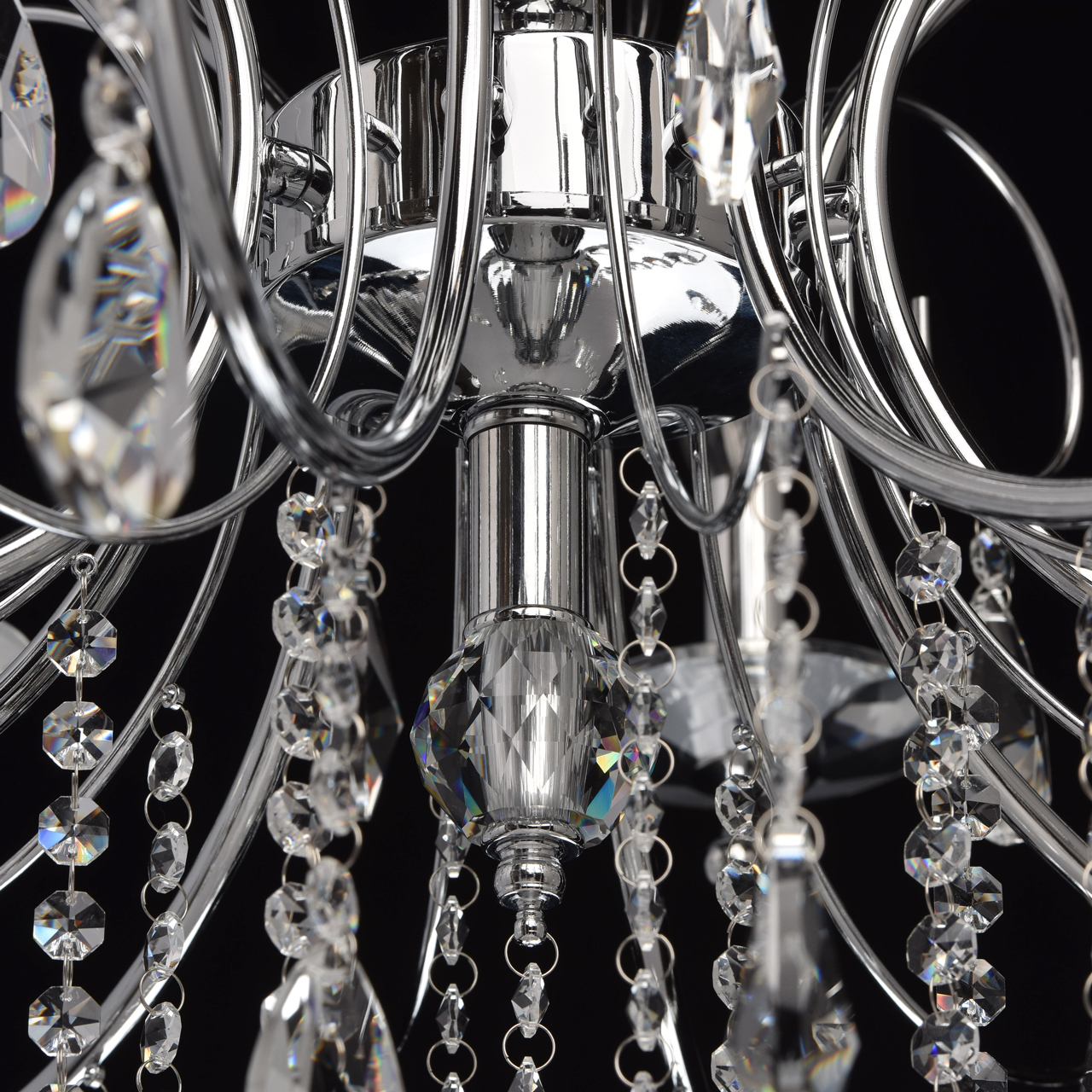 Tradycyjny kształt świecy zapewnia wysokie parametry oświetlenia. Przezroczyste wisiorki kryształowe tworzą magiczną grę światła, a żyrandol wyróżnia się wyjątkową elegancją dzięki cienkim, zakrzywionym rogom w kolorze chromu. Obecność kilku lamp w rodzinie pozwala na kompleksowe oświetlenie pokoju. Lampa premium w przystępnych cenach.