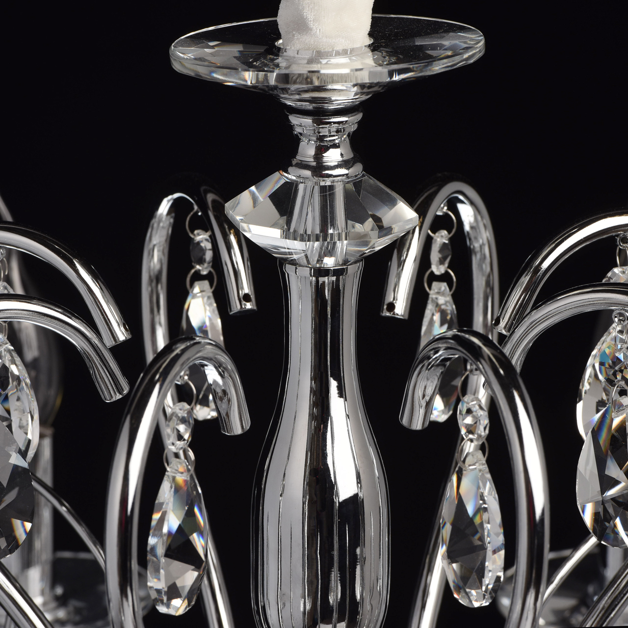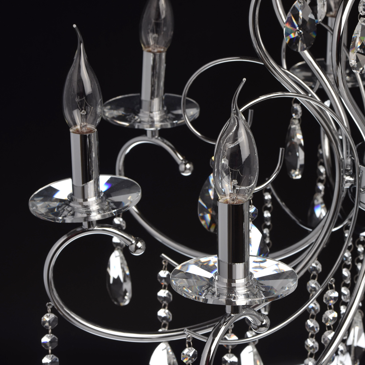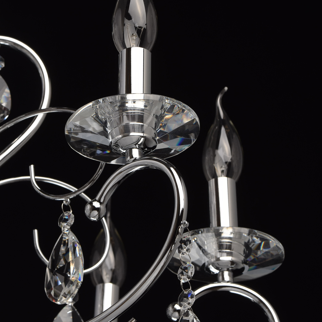 Tradycyjny kształt świecy zapewnia wysokie parametry oświetlenia. Przezroczyste wisiorki kryształowe tworzą magiczną grę światła, a żyrandol wyróżnia się wyjątkową elegancją dzięki cienkim, zakrzywionym rogom w kolorze chromu. Obecność kilku lamp w rodzinie pozwala na kompleksowe oświetlenie pokoju. Lampa premium w przystępnych cenach.