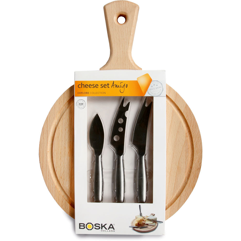 Deska okrągła i noże do serów Amigo Boska. Czy przyjaciele przychodzą do Ciebie, czy organizujesz happy hour? Z pewnością potrzebujesz deski do pysznych serów, która będzie towarzyszyć imprezie! Który ser wybierzesz na ten czas? Brie, Gouda lub ser pleśniowy? Z tym zestawem Amigo masz wszystko, czego potrzebujesz, aby stworzyć stylową prezentację tych serów.