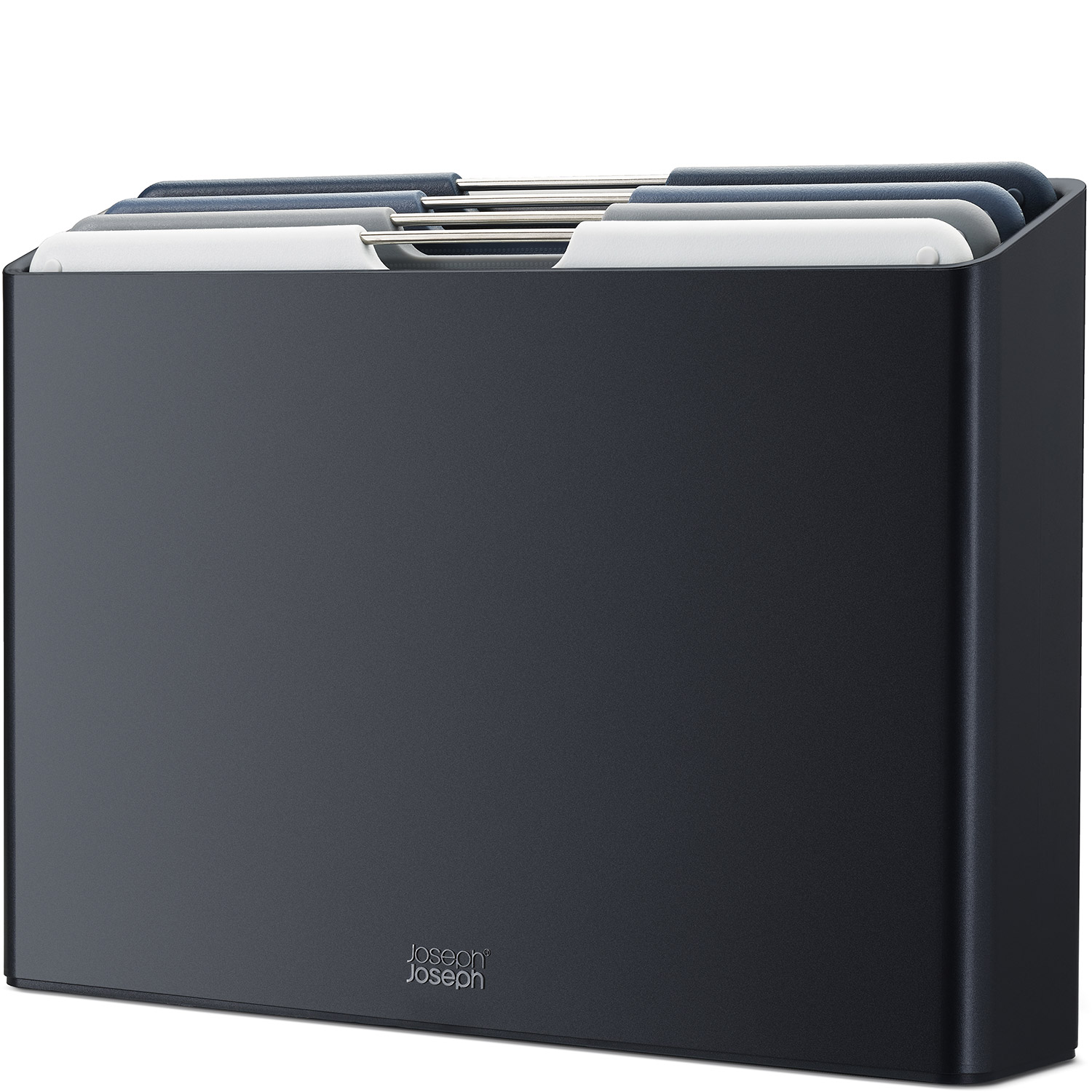 Deski kuchenne do krojenia w grafitowym stojaku Folio Joseph Joseph, posiadają fakturowaną powierzchnię, bezpieczną dla ostrzy noży. Zestaw desek do krojenia w stojącym, wąskim futerale przyciąga wzrok ciekawym wyglądem. Każda z desek jest w innym odcieniu szarości. Deski do krojenia Joseph Joseph zostały dodatkowo wyposażone w antypoślizgowe nóżki, które nie pozwolą na przesuwanie się po blacie roboczym. Do łatwego wyjmowania i wkładania desek zastosowano stalowy uchwyt. Przestrzenie między deskami pozwalają powietrzu swobodnie krążyć. Tworzywo sztuczne, z którego są wykonane jest materiałem trwałym, higienicznym, odpornym na zapachy i bezpiecznym dla noży. Nadają się do mycia w zmywarce, zaś futerał wystarczy przetrzeć wilgotną ściereczką. Elegancki zestaw desek jest estetycznym i praktycznym dodatkiem w kuchni.