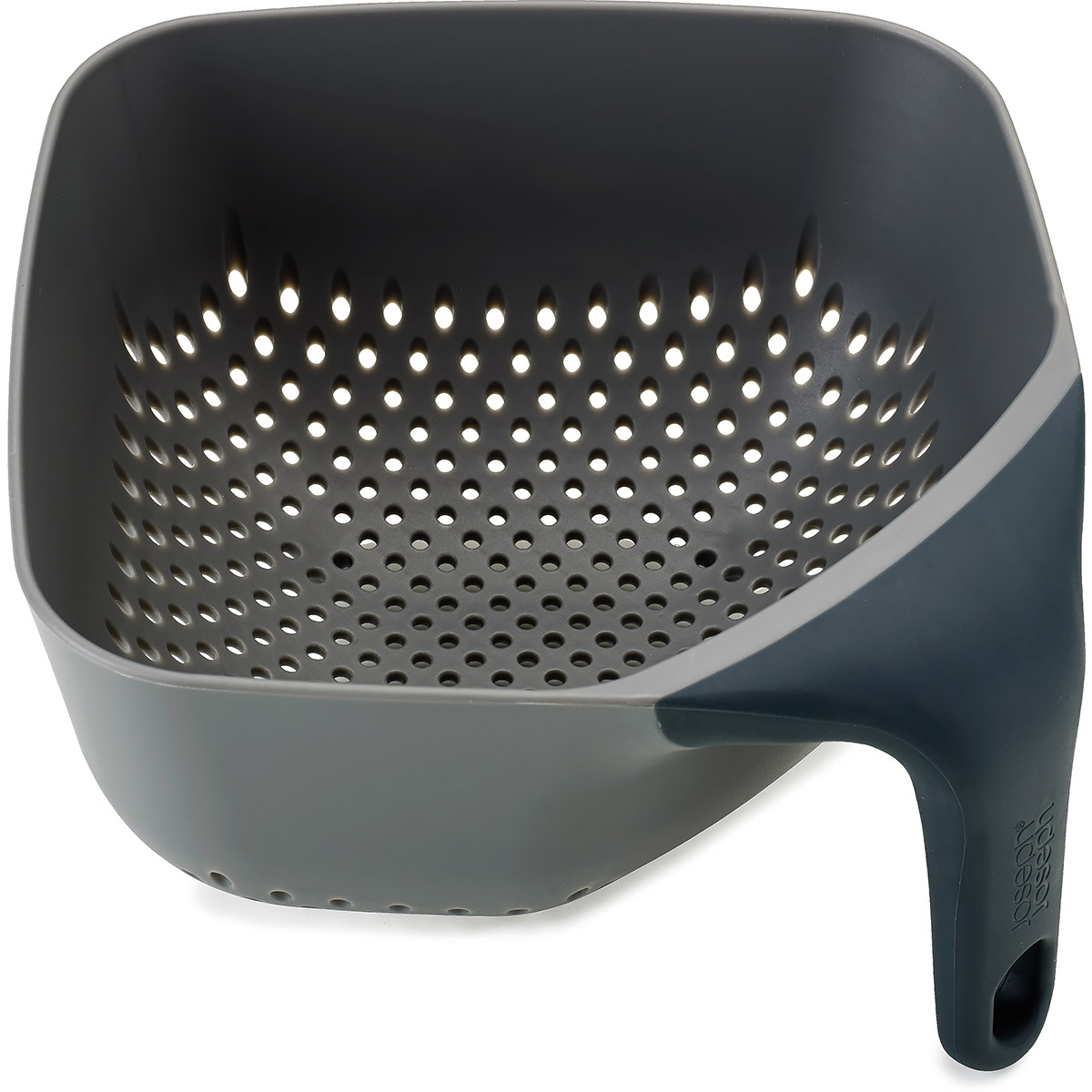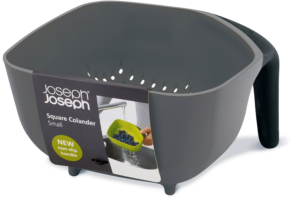 Kwadratowy durszlak marki Joseph Joseph to stabilne, lekkie i ergonomiczne narzędzie, które jest niezbędne w kuchni. Stawiając go na blacie albo w zlewie, nie przechyla się, rączka pokryta silikonem służy jako podpórka i wspomaga trzy nóżki. Silikonowy uchwyt jest wygodny, dobrze się go trzyma w dłoni, a wieszając go między komorami zlewu utrzyma stabilnie całą swą zawartość.