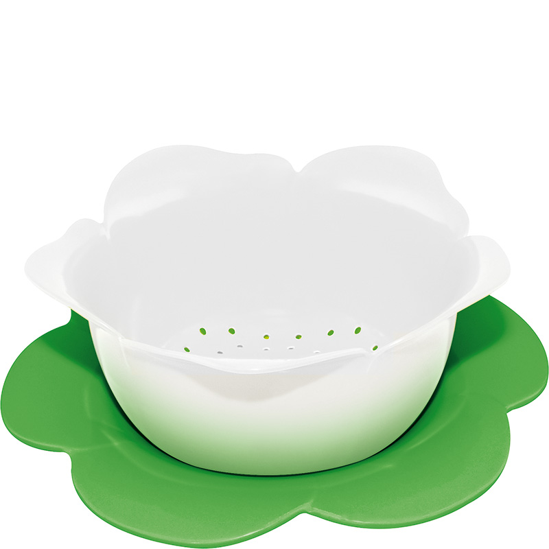 Durszlak marki ZAK! Designs wykonany jest z melaminy, tworzywa odpornego na zarysowania oraz wysokie i niskie temperatury. Durszlak swym kształtem przypomina różę w rozkwicie. Idealanie nadaje się aby płukać w nim owoce lub odcedzać makaron. Jednak jego forma zachęca, aby wypełnić go owocami i postawić na jadalnianym stole lub ogrodzie. Dołączona podstawka w kolorze zielonym, zatrzyma wodę ociekającą z owoców lub warzyw.
