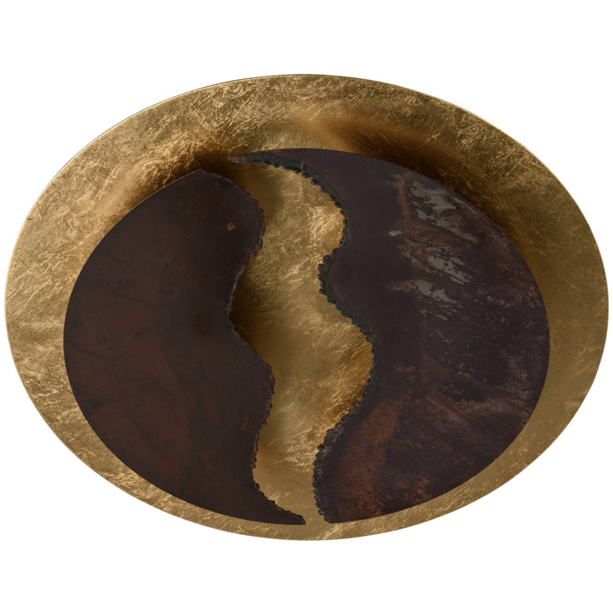 Duża lampa industrialna, złoto-rdzawa RegenBogen Industrial. Złota, okrągła podstawa lampy ma średnicę 50 cm, montowana przy suficie odbija ciepłe światło LED. Podstawa wykończona jest folią aluminiową w kolorze złotym o interesującej strukturze, dzięki czemu światło jest ładnie rozproszone. Na podstawie zamocowany został metalowy okrąg w kolorze rdzy, rozcięty w połowie, tworząc interesującą formę. Pod dwoma metalowymi elementami umieszczone zostały żarówki LED, z który utworzona została ciekawa forma świetlna.