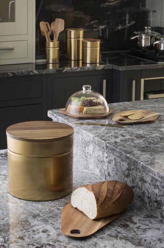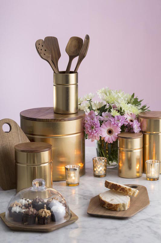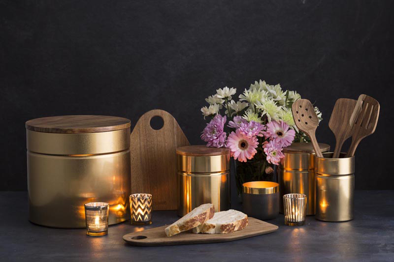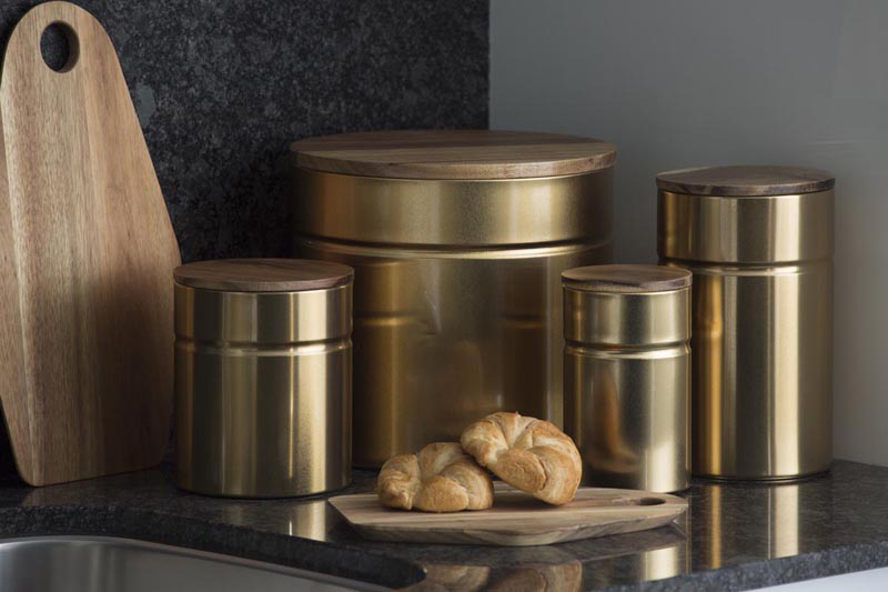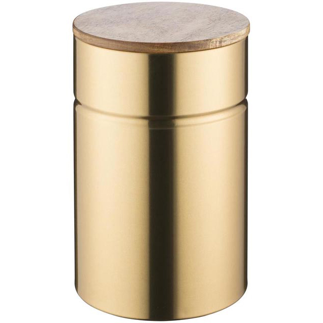 Duży pojemnik kuchenny złoty Modern Kitchen Typhoon o pojemności ok. 2,85 Litra. Umieścisz w nim produkty sypkie takie jak: cukier, mąka, kawa, herbata, czy makaron. Pojemnik wykonany został z metalu pomalowanego na kolor złoty. Pokrywa wykonana z drewna akacjowego wyposażona w silikonową uszczelkę, dzięki czemu pojemnik jest hermetyczny.
