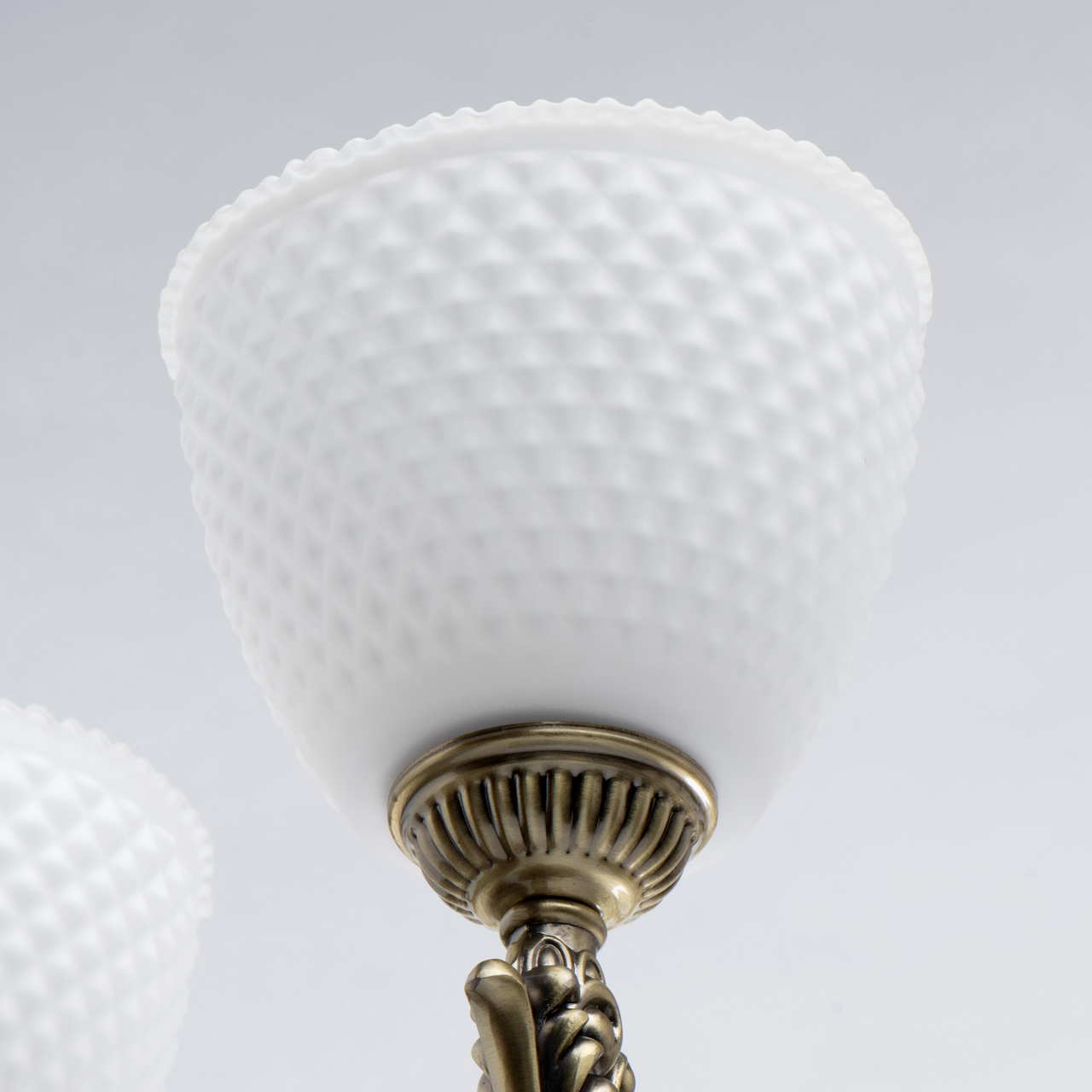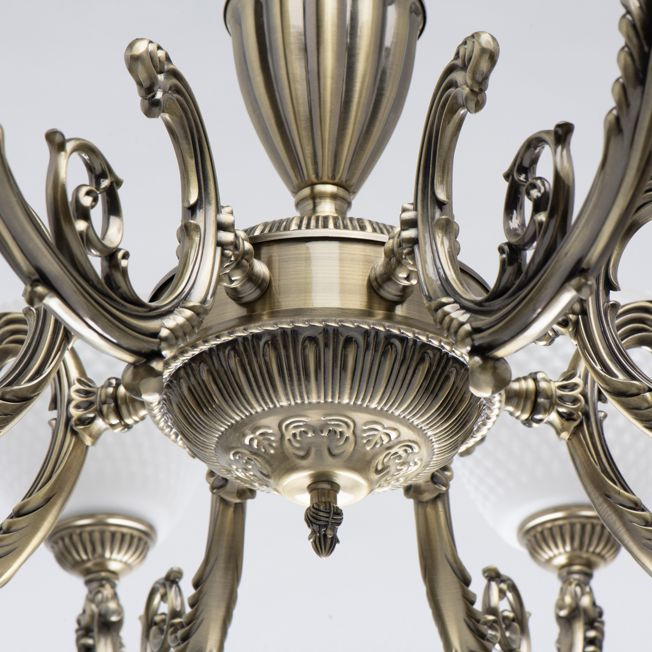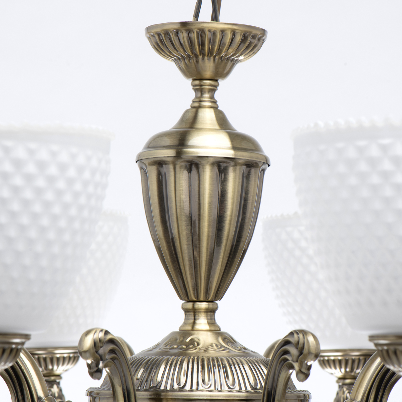 Duży żyrandol z białymi kloszami, postarzany mosiądz Felice MW-LIGHT Classic. Dekory w postaci odlewów artystycznych nadają mu delikatną lekkość. Teksturowane plafony z angielskim ornamentem są skierowane w górę, tworząc miękkie światło. Bogaty, biały kolor kloszy jest uniwersalny i wszechstronny, odpowiedni do większości wnętrz. Felice to kompletna rodzina żyrandoli na 5 i 8 żarówek, lampy wiszącej i kinkietu. Regulowana wysokość żyrandola dzięki ogniwom łańcucha.