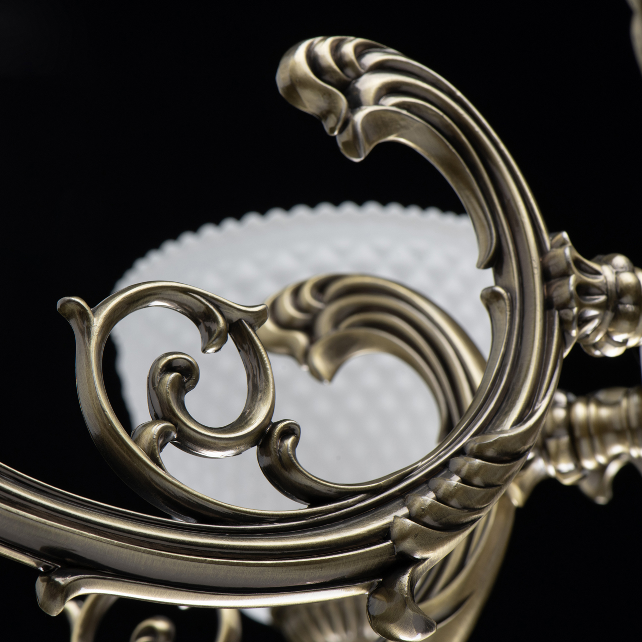 Podstawa lampy wykonana jest z połączenia stopów metali i jest ocynkowana na kolor antycznego brązu. Ramiona są wykonywane przy użyciu technologii odlewania artystycznego ze stopu aluminium. Lampa ozdobiona jest szklanymi kloszami pomalowanymi na biało i odlanymi w złożonym kształcie.
