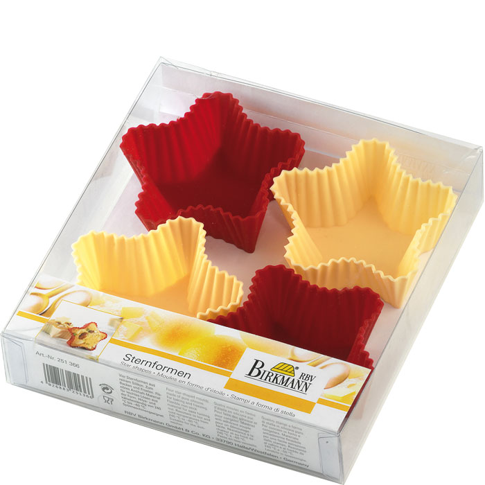 Foremki do muffinów w kształcie gwiazdek marki Birkmann wykonane z silikonu, ułatwiającego wyjmowanie świżo upieczonych ciastek oraz ich beztłuszczowe pieczenia. Od dzisiaj można podać muffinki o innym kształcie niż tradycyjne, doskonale nadadzą się do przygotowania pysznych babeczek w kształcie gwiazdek na Święta Bożego Narodzenia. Zestaw słada się z czterech sztuk foremek.