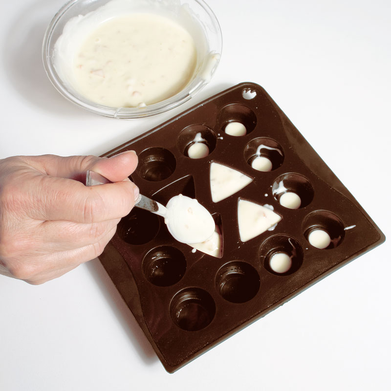 Silikonowa forma do czekoladek o kształcie tradycyjnych pralinek, włoskiego producenta, marki Pavoni. Wykonana została z wysokiej jakości silikonu, materiału, dzięki któremu Twoje czekoladki zawsze się udadzą. Silikon to uniwersalny materiał, który można stosować zarówno podczas wypieków w wysokich temperaturach, jak i mrożenia, uzyskując ciekawe formy lodowe. Pavoni to marka, która od ponad 20 lat wytwarza różnego rodzaju, fantazyjne formy do czekoladek, ciast, ciasteczek, babeczek i muffinek. Przygotujesz w nich także świetne desery, galaretki budynie czy domowe, czekoladowe praliny. Formy są łatwe w utrzymaniu w czystości, ciasta zachowują swój kształt, smak i aromat.