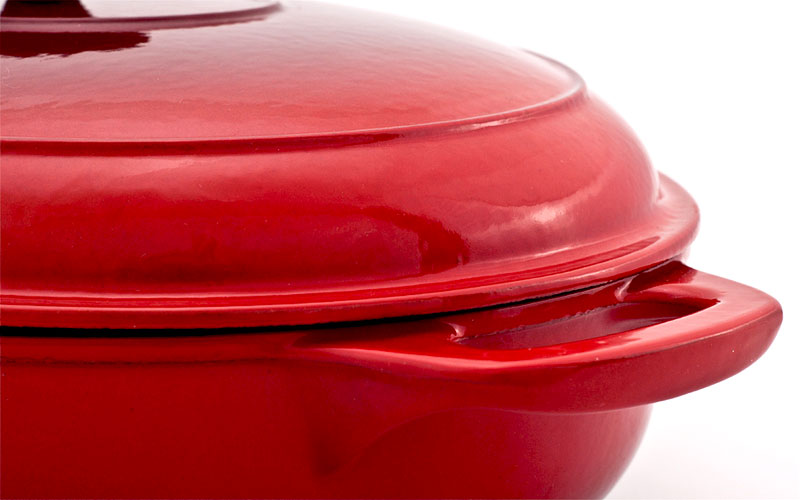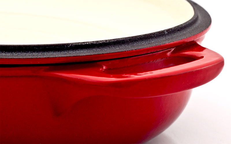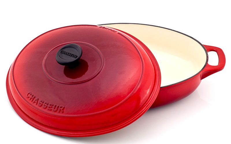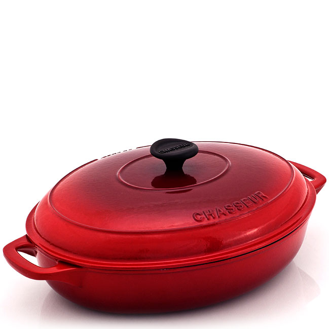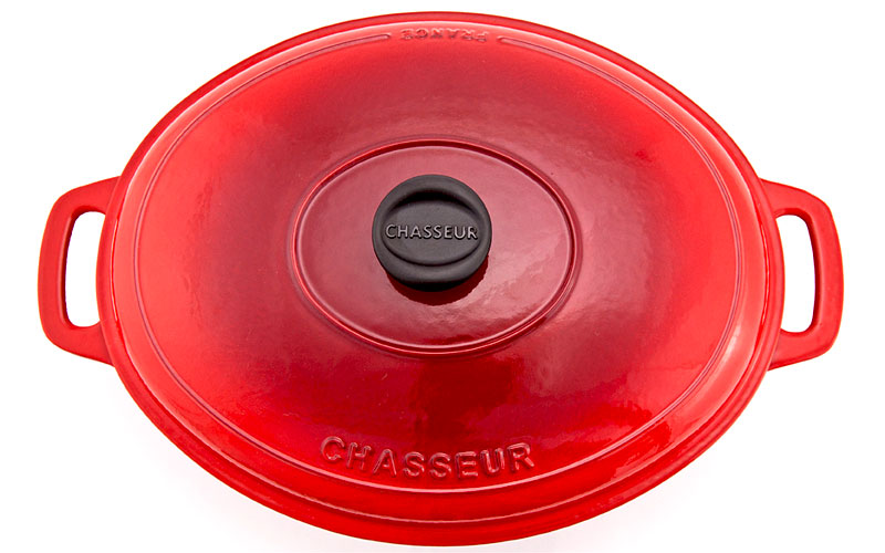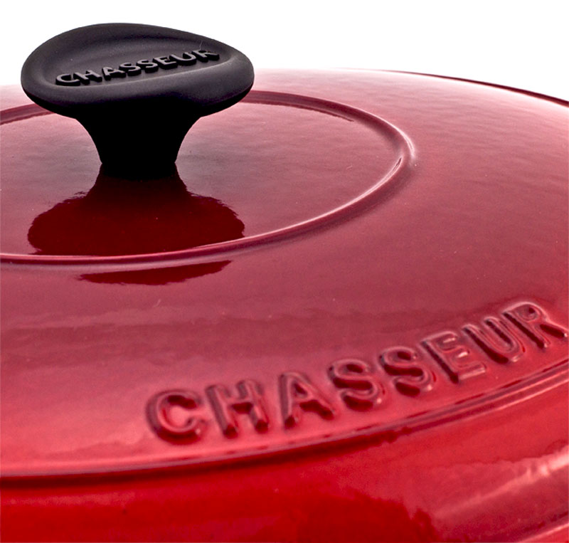 Garnek żeliwny emaliowany owalny Chasseur z kolekcji Classic. Nasze Babcie i Mamy z pewnością pamiętają smak potraw z tzw. żeliwniaka. Jeszcze niedawno bardzo trudno było zakupić garnki tego typu, ale dzisiaj powraca szansa na zdrowe gotowanie dzięki możliwościom zakupu garnków żeliwnych. Wszystkie prace kuchenne takie jak gotowanie, pieczenie, duszenie, smażenie czy też zapiekanie w piekarniku dzięki żeliwnym naczyniom stają się szybsze i dużo bardziej efektywne. Każdy kto lubi dobrą kuchnię, używając garnków żeliwnych, może mieć pewność, że potrawy w nich przyrządzone będą smakować niezwykle. Pokryte emalią wnętrze naczyń Chasseur pozwala na uzyskanie intensywnego smaku potrawy. Wypustki znajdujące się na wewnętrznej stronie pokrywki wspomagają cyrkulację płynów w zamkniętym naczyniu. Potrawa dusi się w sosie własnym nie tracąc przy tym wartości odżywczych. Dzięki nadzwyczajnym właściwościom rozprowadzania i utrzymywania ciepła, jakim charakteryzuje się odlewane żeliwo, przygotowywana potrawa nagrzewana jest równomiernie ze wszystkich stron oszczędzając przy tym energię. Żeliwo emaliowane jest idealne do grillowania, gotowania, podpiekania, czy tylko odgrzewania. Charakteryzuje je odporność na wysokie temperatury. Absorbuje i zatrzymuje ciepło, dzięki czemu utrzymuje temperaturę potrawy. Z pewnością ogromną zaletą jest to, że nadają się do wszystkich typów kuchenek. Łatwość w użyciu i utrzymania w czystości to także niewątpliwe zalety tych naczyń. Podwójna warstwa emalii oraz czarne wykończenie krawędzi zapobiegają korozji. Garnki te są odporne na zużycie. Naczynia można myć w zmywarce. Charakter tych garnków, dzięki jakości wykonania i kolorystyce sprawiają, że przygotowaną w nich potrawę można serwować bezpośrednio na stół. Spełniają wszystkie przepisy dotyczące higieny żywności.