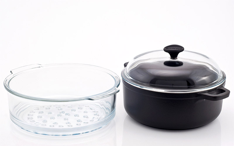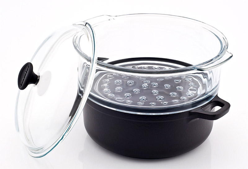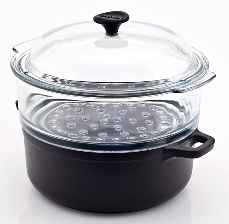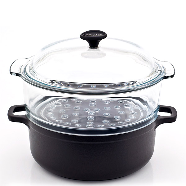 Garnek żeliwny z naczyniem do gotowania na parze marki Chasseur to oferta dla osób preferujących zdrowe odżywianie. Dolna części naczynia to garnek żeliwny, dzięki czemu przygotowanie potrawy będzie szybsze i oszczędzi energię. Żeliwna część, którą napełniamy wodą nagrzewa się szybko i rozprowadza ciepło równomiernie. Umieszczone w górnej części naczynia szklanego ryby, mięso czy warzywa duszą się 'na parze' nie tracąc przy tym wartości odżywczej witamin i minerałów.