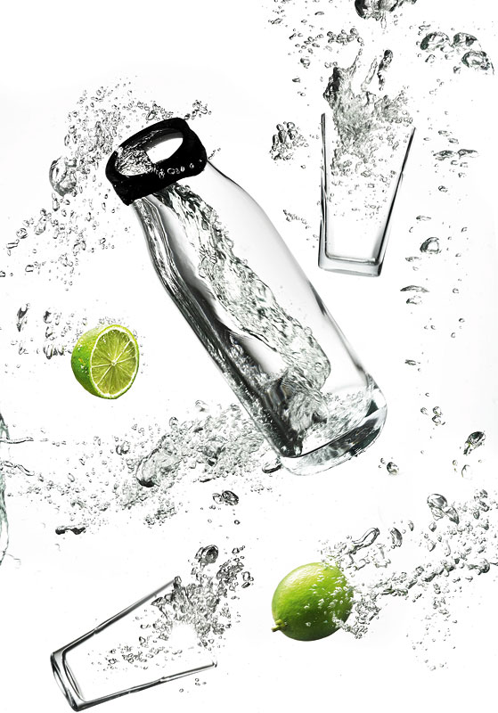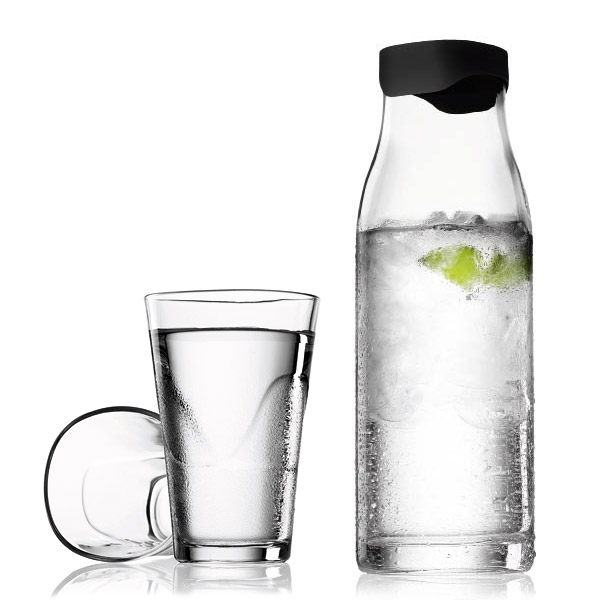 Szklana karafka na wodę to odświeżona reinterpretacja klasycznej butelki na wodę. Do zestawu dołączone zostały dwie szklanki. Karafka posiada specjalny, ochronny stalowy kołnierz oraz czarną nakrętkę, która otwiera się automatycznie, gdy chcesz rozlać wodę. Jednocześnie nakrętka trzyma kostki lodu i plasterki cytryny, by nie wpadały do szklanek. Karafka wspaniale zaprezentuje się wypełniona wodą oraz innymi napojami.