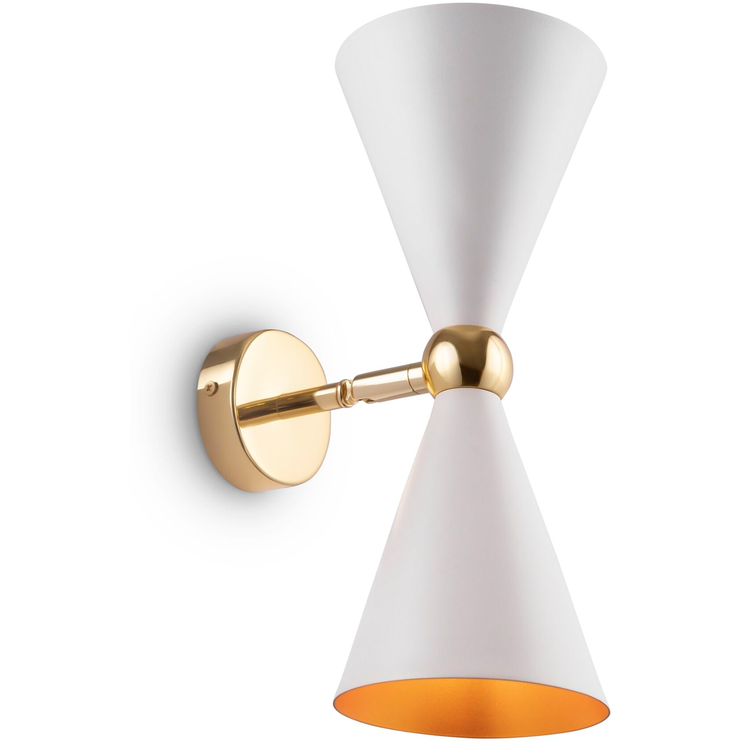 Kinkiet dwa białe stożki Vesper Maytoni. Atrakcyjnie wyglądający kinkiet składający się z metalowych stożków, w który umieścisz żarówki. Wnętrza stożków pomalowane są na kolor złoty, dzięki czemu uzyskasz ciepły blask. Jeden stożek skierowany jest w górę, na sufit, drugi w dół, doświetlając pomieszczenie.