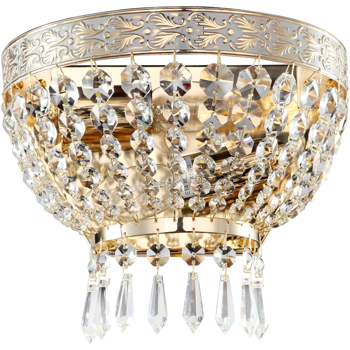 Kinkiet kryształowy, złota podstawa Bella Maytoni Classic. Metalowa rama. Patynowana taśma mosiężna z wzorem. Różnorodność cięć zawieszek kryształowych.