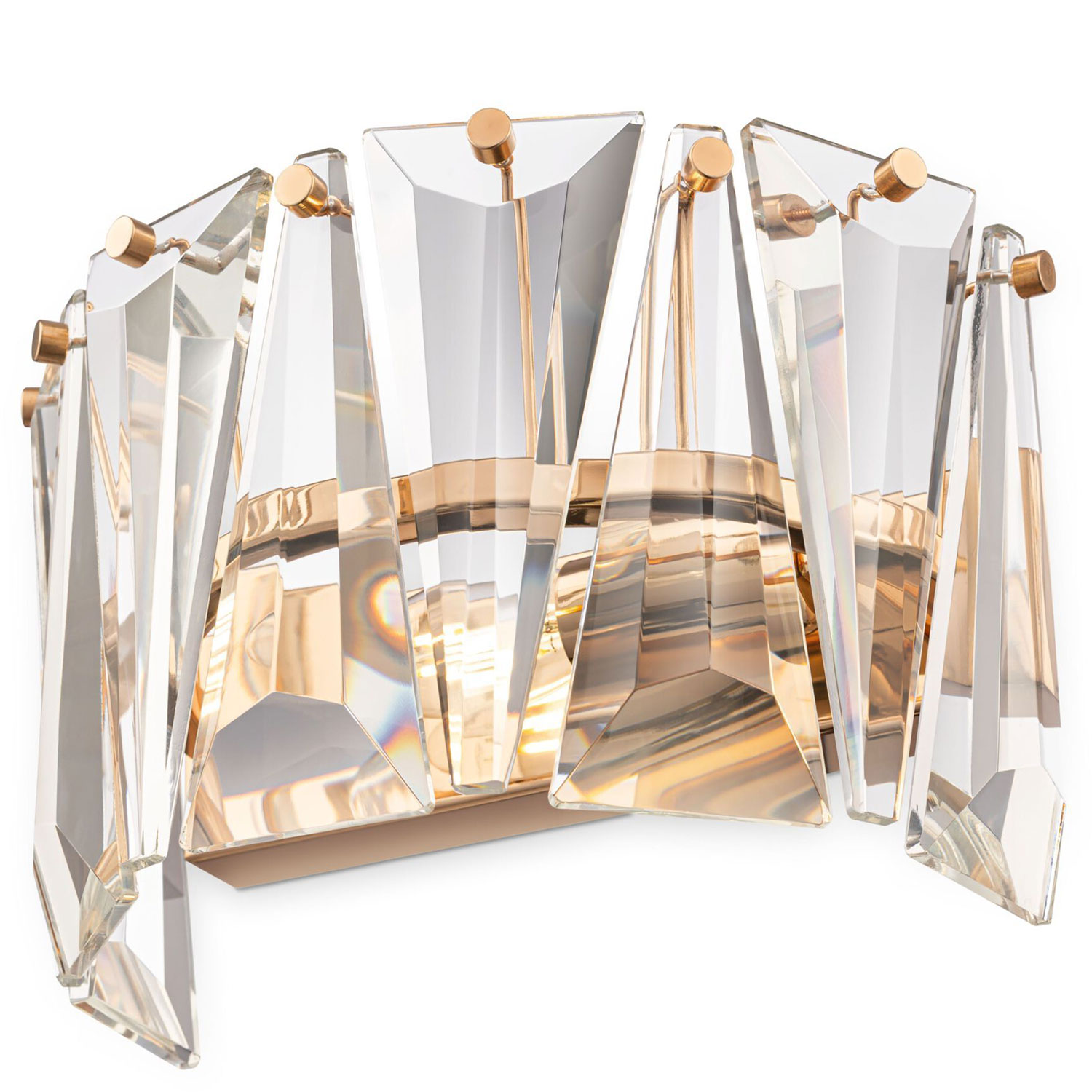 Kinkiet złoty, szklany do salonu Puntes Maytoni. Uzupełnienie kolekcji oświetlenia wiszącego Punters. Na metalowej, złotej ramie, umieszczono szklane stożków, które rozpraszają światło. Blask szklanych elementów uzyskano dzięki weneckiemu procesowi produkcji Unique Glass, który zapewnia ich wyjątkową czystość.