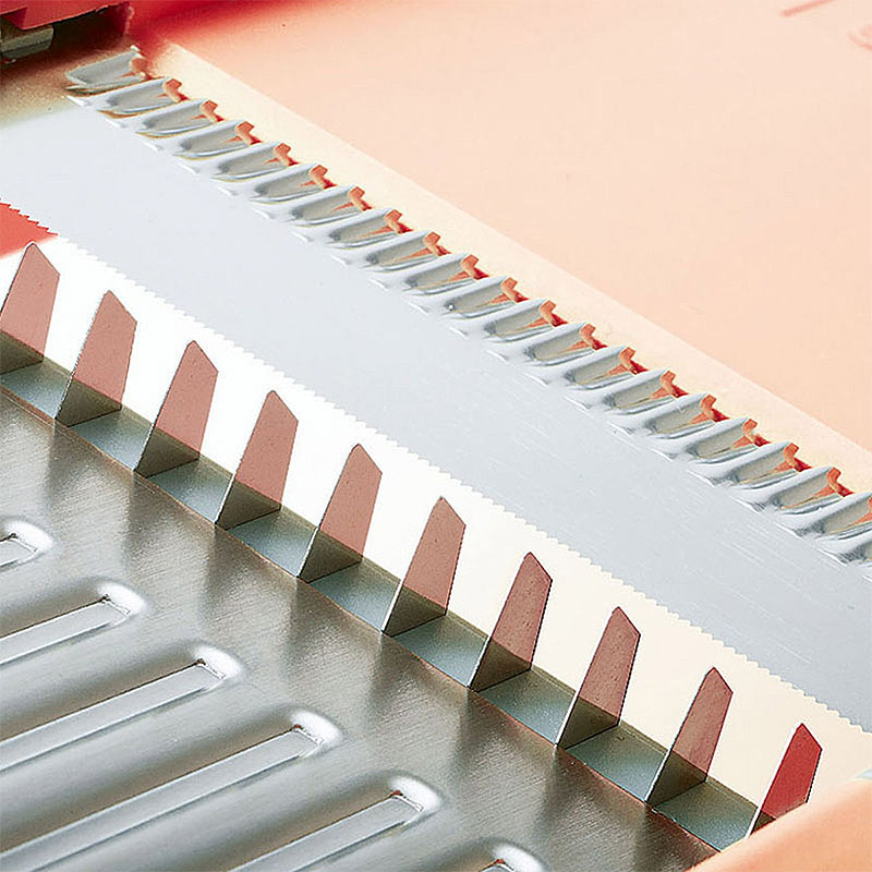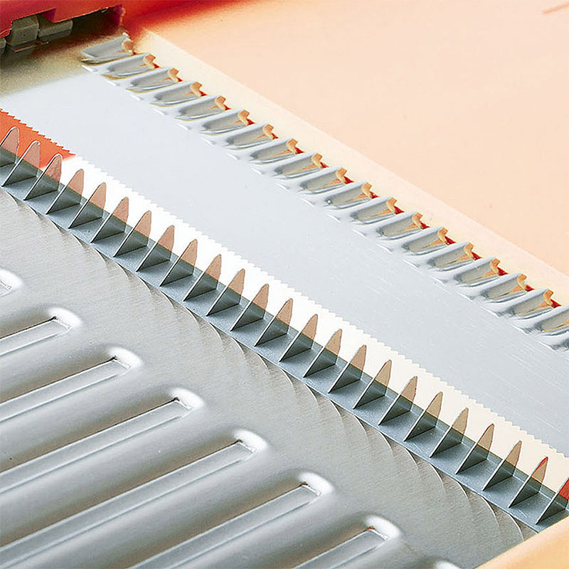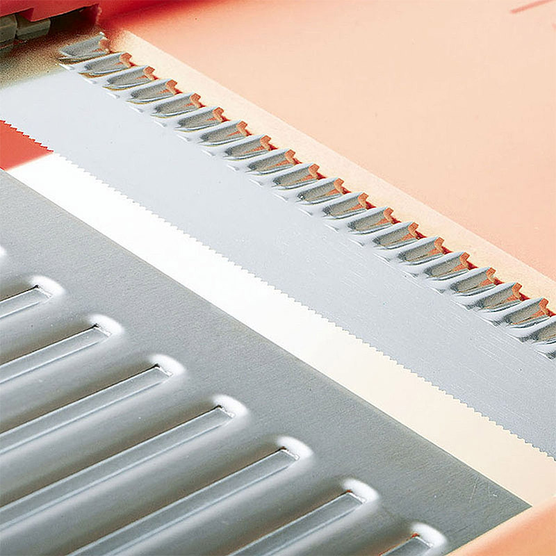 Niezwykle wygodna w użyciu. Można ją zarówno trzymać w ręce w pozycji pionowej, jak również ustawić na blacie kuchennym pod kątem 45 stopni. Krajalnica ma dwie nóżki pokryte antypoślizgowym materiałem oraz rączkę również z tego samego tworzywa. To sprawia, że pewnie leży w dłoni i ułatwia pracę. Przy krojeniu większej ilości warzyw mandolinę można wygodnie ustawić na blacie. Specjalna składana podpórka utzymuje urządzenie na miejscu i pod właściwym kątem. Bezpieczna krajalnica kuchenna, która została wyposażona w specjalny uchwyt. Jednocześnie zabezpiecza on palce i przytrzymuje krojone warzywo, dzięki plastikowym, ostrym wypustkom oraz metalowym kolcom.