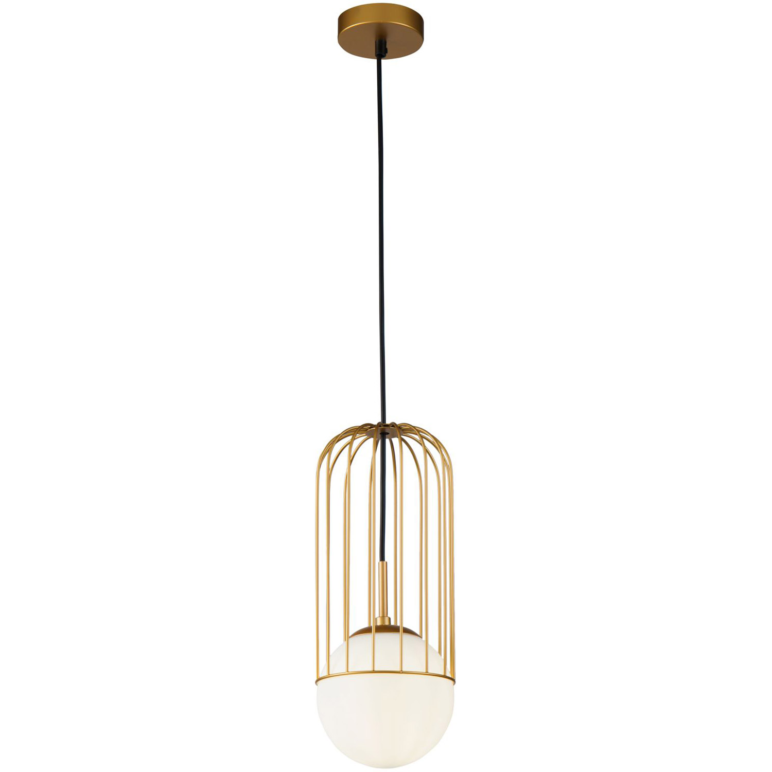 Lampa do jadalni - kuchni - biała kula w złotej klatce Telford Maytoni. Popularne i modne rozwiązanie oświetlenia, składającego się z jednej szklanej kuli osłaniającej żarówkę. Pochodzi z dużej kolekcji oświetlenia Telford. Biała kula z żarówką umieszczona jest w prostej konstrukcji w kolorze złotym, dając tym dużo światła. Przeznaczona do pomieszczeń urządzonych w stylu zarówno klasycznym jak i industrialnym. Dobrze będzie współgrała zarówno z białymi ścianami jak i ceglanymi, a nawet z surowego betonu. Sprawdź, czy będzie odpowiednia do Twojego domu.