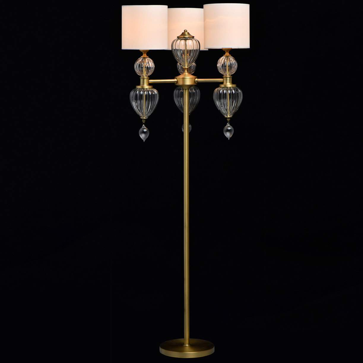 Podstawa lampy wykonana jest z metalu i ocynkowana w kolorze mosiądzu. Lampa ozdobiona jest ręcznie dmuchanym szkłem. Białe, tekstylne klosze z odpornym na ciepło akrylem wewnątrz, obszyte lamówką i przeszyte.