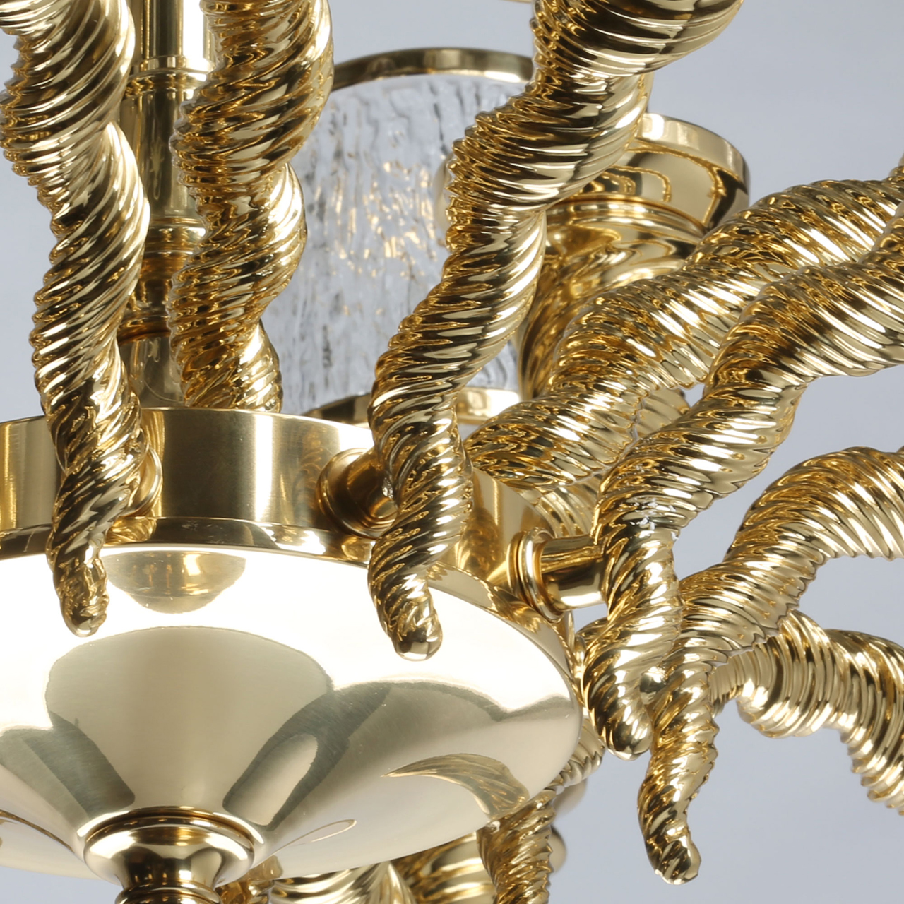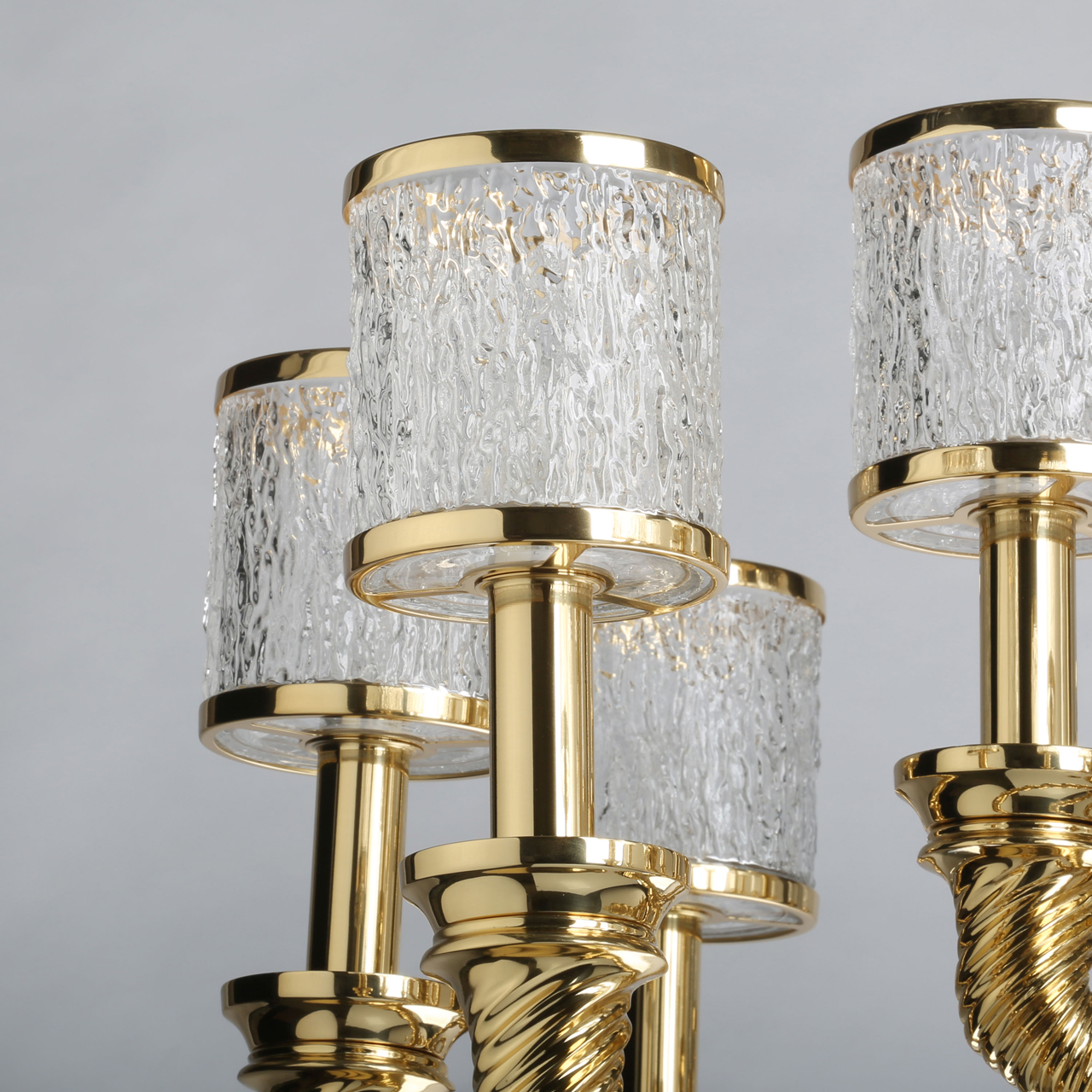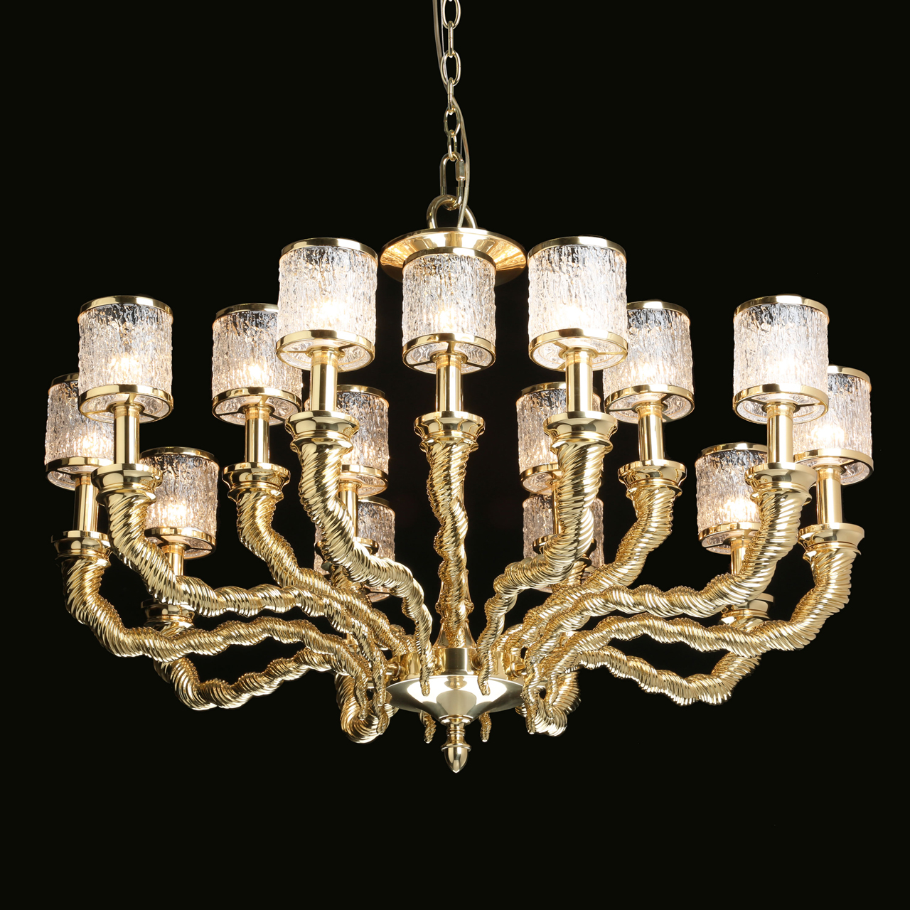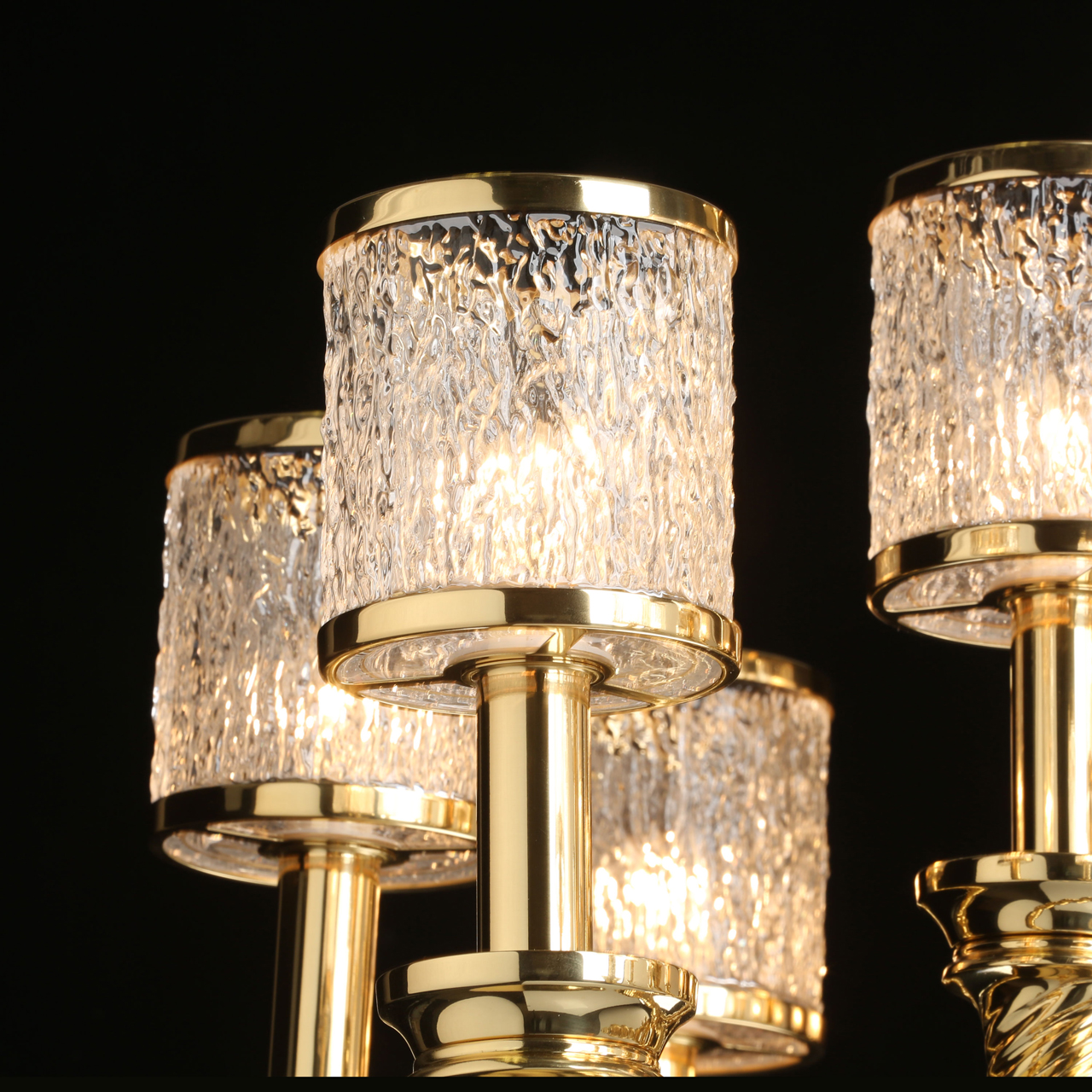 Luksusowy żyrandol mosiężny w stylu neoklasycznym Sofia CHIARO. Luksusowy design w stylu neoklasycznym. Mosiężna podstawa z osobliwym efektem połysku uzyskanym przez dodatkowe polerowanie. Ramię z odlewu artystycznego w stylu Gaudiego. Szklany klosz z teksturą delikatnie rozprasza światło. Duża średnica zapewnia wysokie parametry świetlne. Podstawa mosiężna. Unikalne ramię wykonane jest metodą odlewania artystycznego z polerowaniem. Wyrafinowane, szklane klosze mają mosiężne wykończenia.