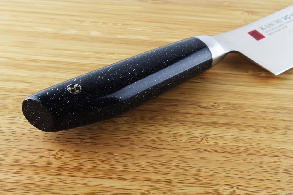 Mały nóż Santoku o ostrzu zaledwie 13 cm marki Kasumi z serii VG-10 Pro. Krótkie ostrze wykonane zostało z monolitycznej stali wysokowęglowej, zapewniającej większą elastyczność ostrza i odporność na pękanie niż stal tzw. damasceńska. Wygodna rękojeść wykonana z polimerów ma właściwości antybakteryjne.