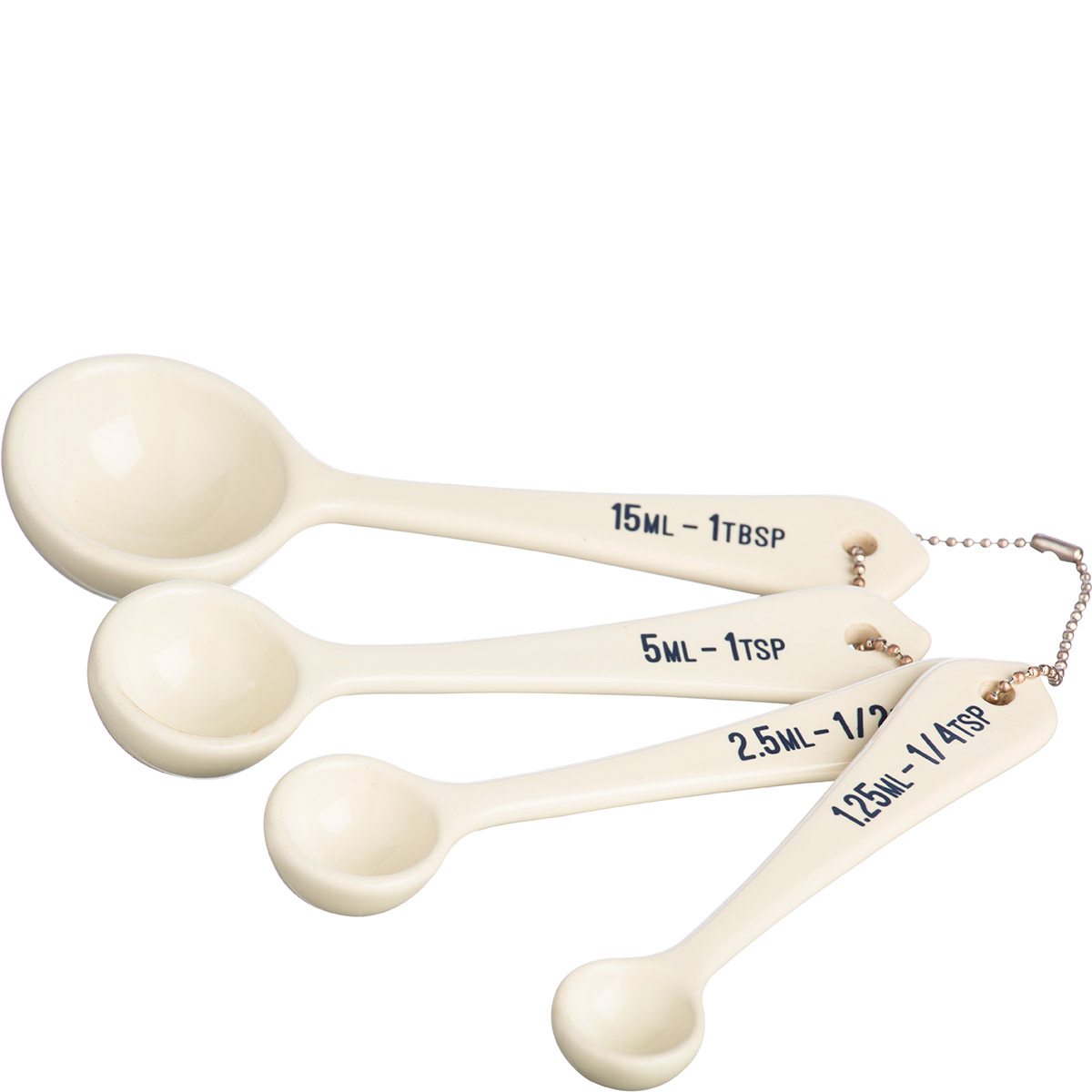 Miarki kuchenne - łyżeczki Varsity marki Mason Cash. Zestaw składa się z czterech łyżeczek o pojemnościach od 15 do 1,25 ml. Miarki wykonane zostały z ceramiki odpornej na odpryskiwanie. Połączenie łańcuszkiem sprawia, że są zawsze pod ręką i się nie gubią.