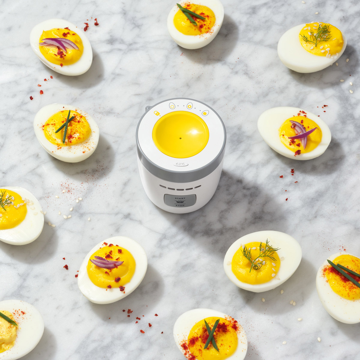 Górnym pokrętłem określamy stopień ugotowania jajka poprzez wybór 1 z 7 ustawień, przy czym 1 oznacza jajko ledwo ścięte, a 7 ugotowane na twardo.