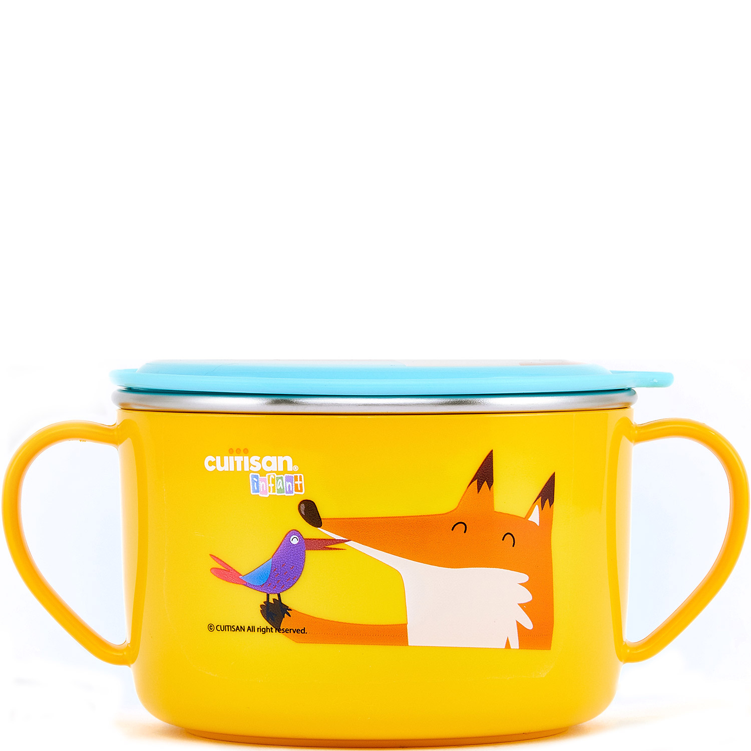 Miseczka z uszami i pokrywką dla dzieci żółta Infant Cuitisan. Pojemność całkowita to 650 ml! Jest bezpieczna dla dzieci - wolna od EDC - substancji zaburzających funkcjonowanie układu hormonalnego. Idealna do ciepłych i zimnych dań oraz zup. Miseczka składa się z dwóch części: