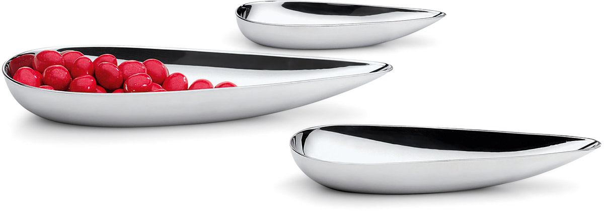 Trzyczęściowy zestaw miseczek Blob marki Philippi nie jest jedynie kuchennym wyposażeniem. Miseczki Blob to prawdziwe, nowoczesne działa sztuki, które zachwycą każdego miłośnika niezwykłego designu. Każda z miseczek wykonana została z wysokogatunkowej stali nierdzewnej. Polerowany na wysoki połysk stop uformowany został w kształt pięknej, delikatnej łezki. Każda miseczka ma inny wymiar – ich długość to kolejno 14, 17 i 23 cm. Naczynia idealnie nadają się do podawania przekąsek i słodyczy. Nierdzewna stal jest całkowicie obojętna biologicznie i odporna na działanie kwasów owocowych i alkoholi, więc nawet wielokrotnie używanie nie spowoduje, że metal straci blask, skoroduje lub sczernieje. Zestaw charakteryzuje się ogromną solidnością i dużą odpornością na zarysowania – cały komplet waży łącznie 0,7kg. Piękne wyposażenie każdej nowoczesnej kuchni i jadalni, które idealnie sprawdzi się w czasie spotkań z przyjaciółmi, eleganckich podwieczorków w gronie rodzinnym lub podczas przyjęć i ważnych uroczystości.