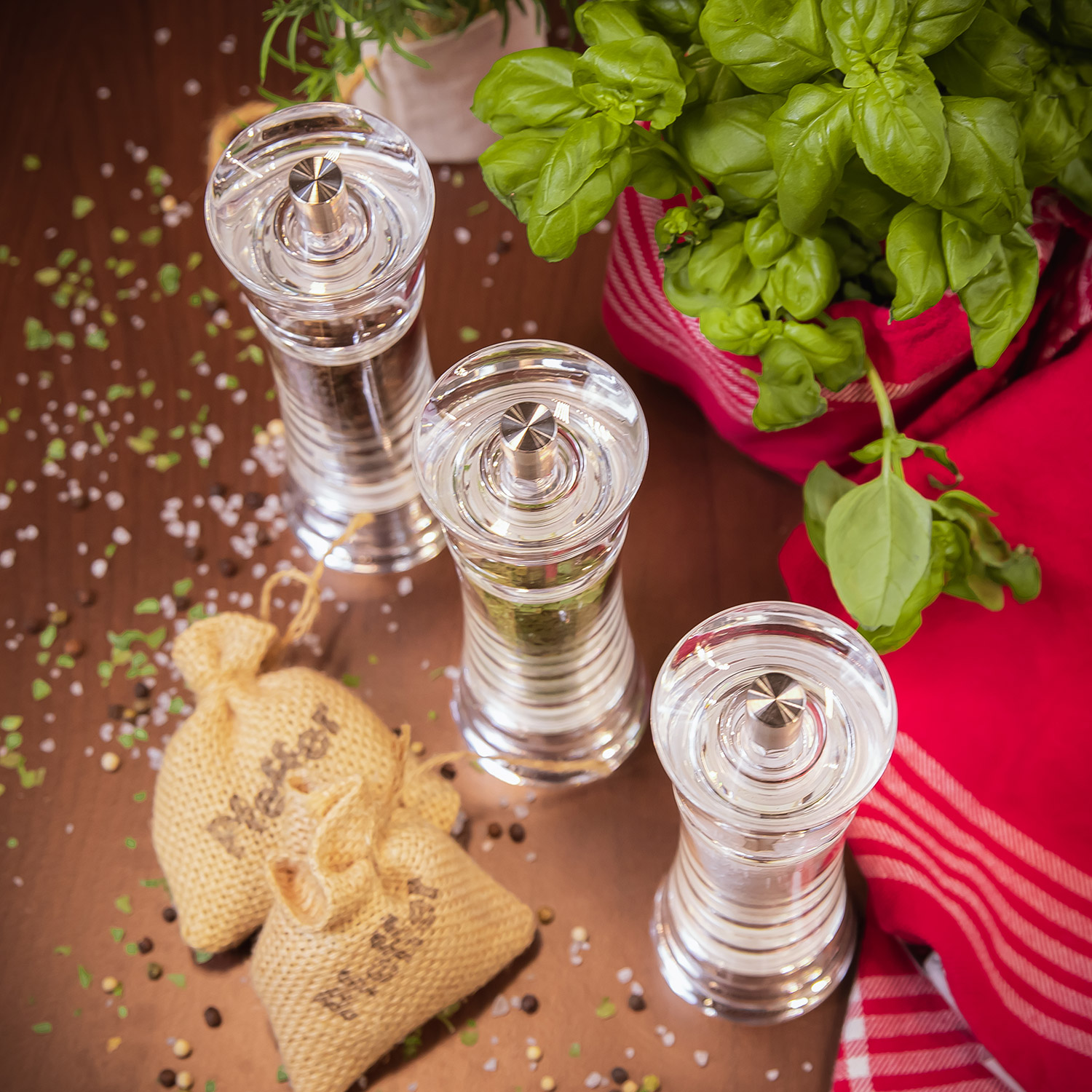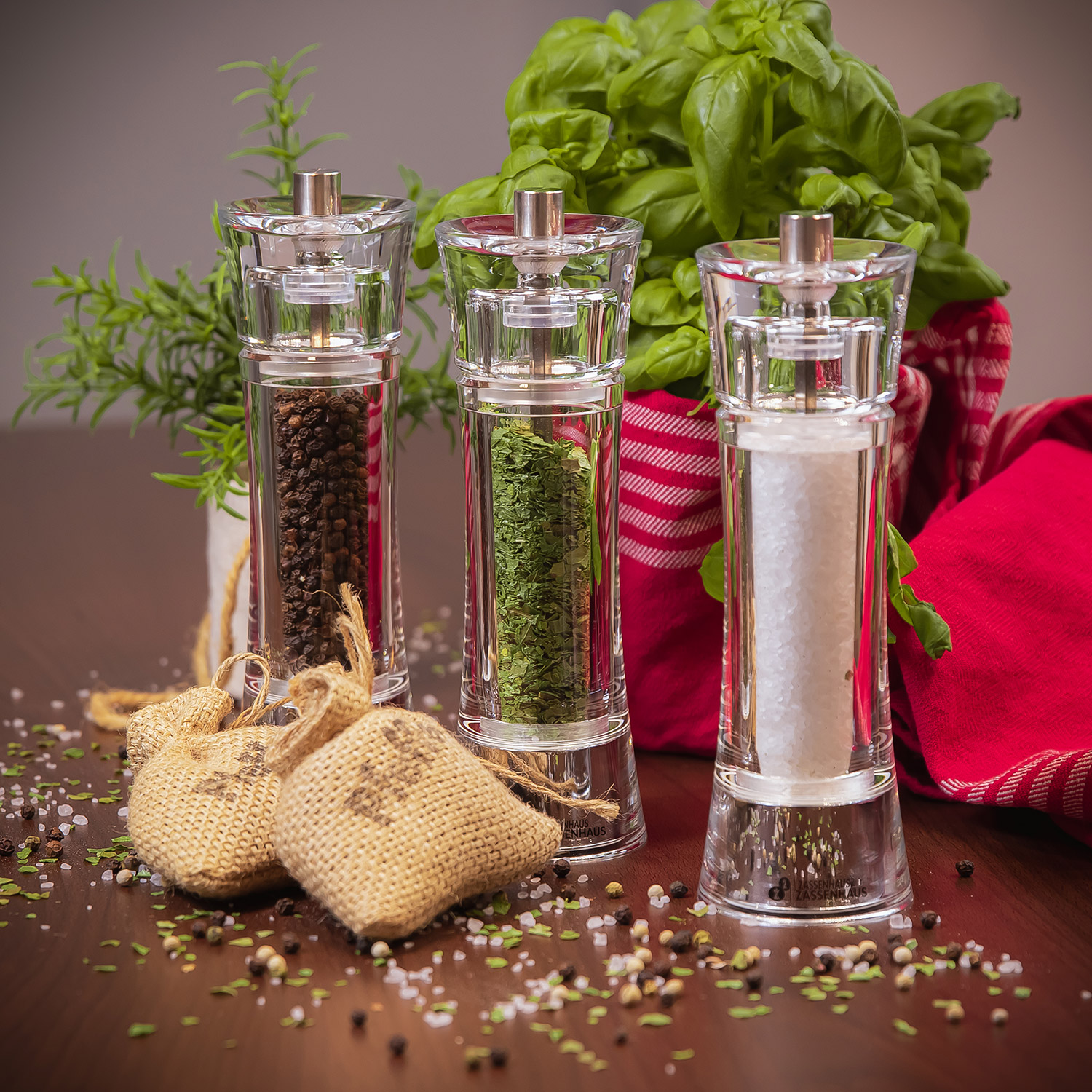Młynek do pieprzu akrylowy 18 cm Aachen Zassenhaus. Wykonany z przezroczystego akrylu wyposażony w niezawodny, ceramiczny, odporny na korozję mechanizm mielący, który zapewni mu bardzo długą żywotność. Producent zapewnia 25 lat gwarancji na mechanizm. Młynek wyposażony w 6-stopniową regulację grubości mielenia od drobnego (1) do grubego (6). Stopnie skali są zaznaczone na mechanizmie cyframi arabskimi.