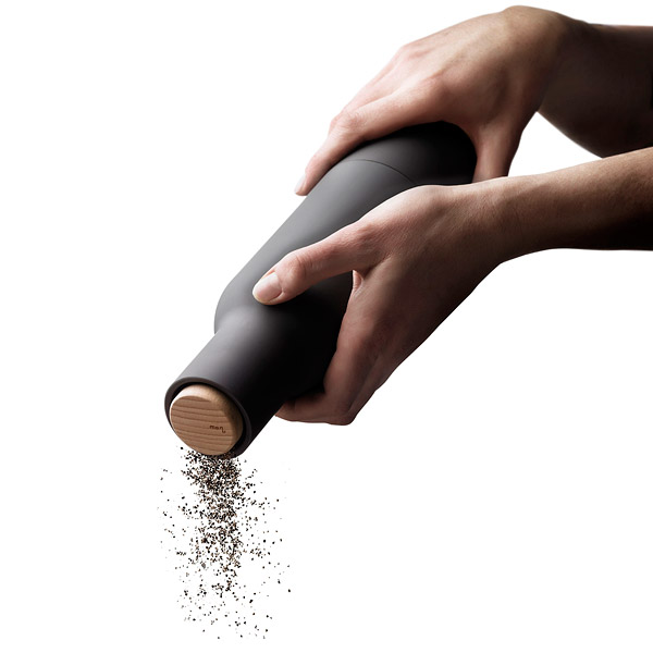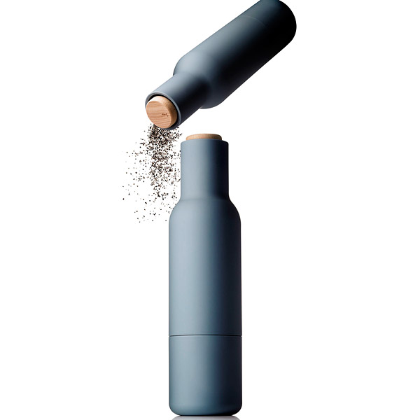 Młynek do pieprzu lub soli w kształcie butelki wykonany z tworzywa sztucznego z dodatkiem drewna. Mechanizm mielący znajduje się w górnej części młynka co zapobiega rozsypywaniu się mielonych przypraw. Aby użyć młynka należy odwrócić go do góry dnem i przekręcić. Dzięki swojemu minimalistycznemu kształtowi pasuje do nowoczesnych wnętrz.