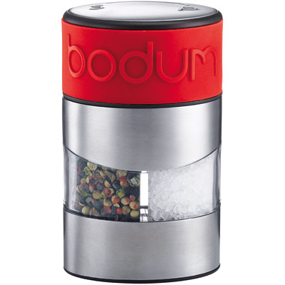 Podwójny młynek do soli i pieprzu wykonany ze szkła i stali nierdzewnej. Został wykończony czerwoną opaską silikonową. Niewielkie rozmiary i prosty projekt pozwalają na to, by młynek ten był zawsze w zasiegu ręki. Dzięki niemu szybko doprawisz ulubione potrawy.