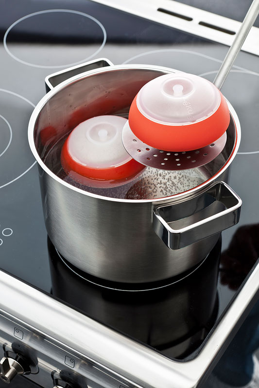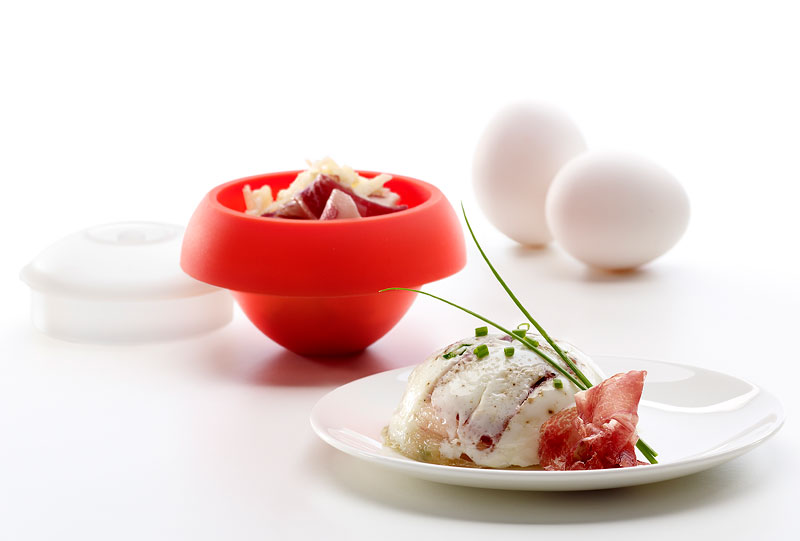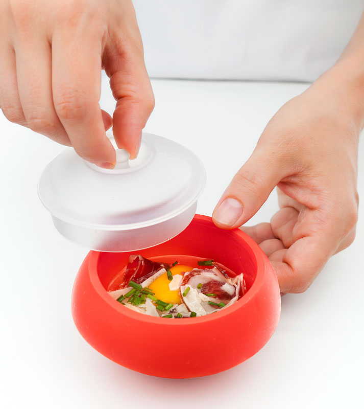 Silikonowe, owalne naczynie do gotowania jajek OVO marki Lekue. Dzięki niemu przygotujesz jajka na miękko, na twardo oraz z dodatkami, np. z cebulą, serem, szynką, łososiem brokułami albo bekonem. Mamy możliwość łączenia smaków oraz nadawania form geometrycznych przygotowywanej potrawy: owalnej, cylindrycznej bądź sześciennej. W zależności, który rodzaj naczynia OVO kupimy. Naczynie wykonane z silikonu, ma nieprzywieralną powłokę i można go używać w kuchence mikrofalowej albo w garnku (metoda kąpieli wodnej). Czyszczenie jest niezwykle łatwe, wystarczy włożyć do zmywarki. Jak się przygotowuje jajka w naczyniu OVO? To bardzo łatwe. Tu znajdziesz instrukcję. Przed pierwszym użyciem posmarować pędzelkiem całą wewnętrzną powierzchnie oliwą. Wbić jajko do naczynia i dodać ulubione składniki. Należy zamknąć naczynie przykrywką i wstawić do garnka z wrzącą wodą bądź kuchenki mikrofalowej. I teraz wystarczy po odpowiednim czasie wyjąć naczynie z przygotowaną potrawą. Gdy gotujemy w garnku: jajko na miękko gotowe będzie między 7-9 minut, średnio miękkie 12 minut, a na twardo 15 minut. Używając kuchenki mikrofalowej używaj mocy 800 W: jajko na miękko to jedyne 35 sekund, średnio miękkie 45 sekund, a na twardo 1 minuta.