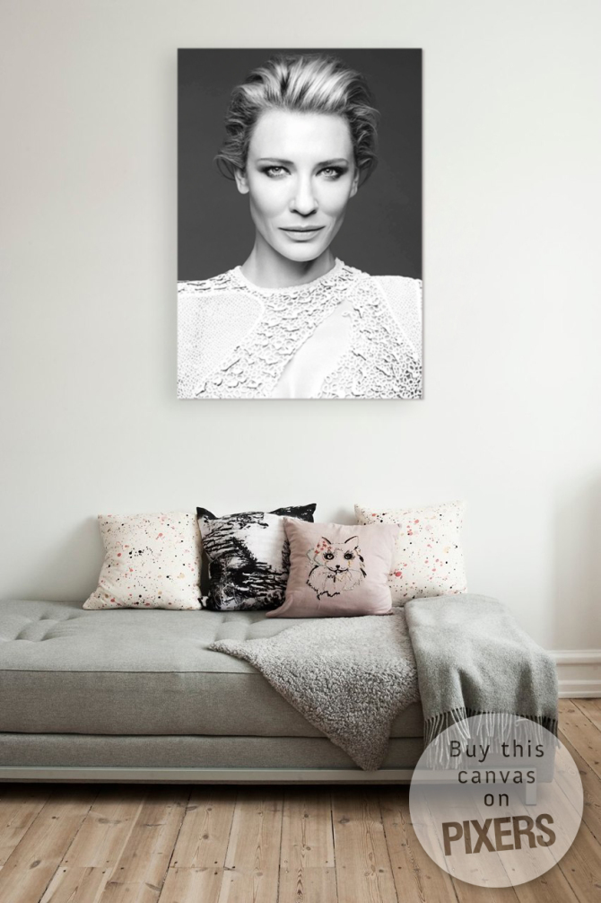 Obraz na płótnie Kate Blanchett to portret znakomitej aktorki wydrukowany na wysokiej jakości płótnie artystycznym Kandinsky. Standardowo oprawiony na drewnianej ramie wewnętrznej, tzw. krośnie, używanej przez malarzy do naciągnięcia płótna tradycyjnego. Krawędzie boczne obrazu są zadrukowane, dzięki czemu obraz jest gotowy do powieszenia bez użycia dodatkowych ram.