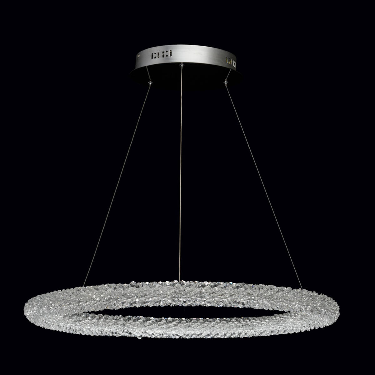 Nowoczesna, okrągła lampa LED wisząca na stalowych żyłkach CHIARO wyposażona w zdalne sterowanie. Wielka, wspaniała, bogato zdobiona lampa, która może służyć w wysokich pomieszczeniach jako lampa wisząca. Delikatne piękno kryształowego okręgu i urok światła LED w pomieszczeniach takich jak: salon, poczekalnia, duża sala czy hol, sypialnia, a nawet recepcja. Pasuje do pomieszczeń odznaczających się nowoczesnym wystrojem i nastrojowym klimatem. Żyrandol bez trudu rozświetli duże wnętrza i wprowadzi do nich nastrój.