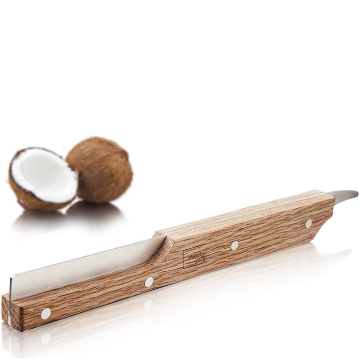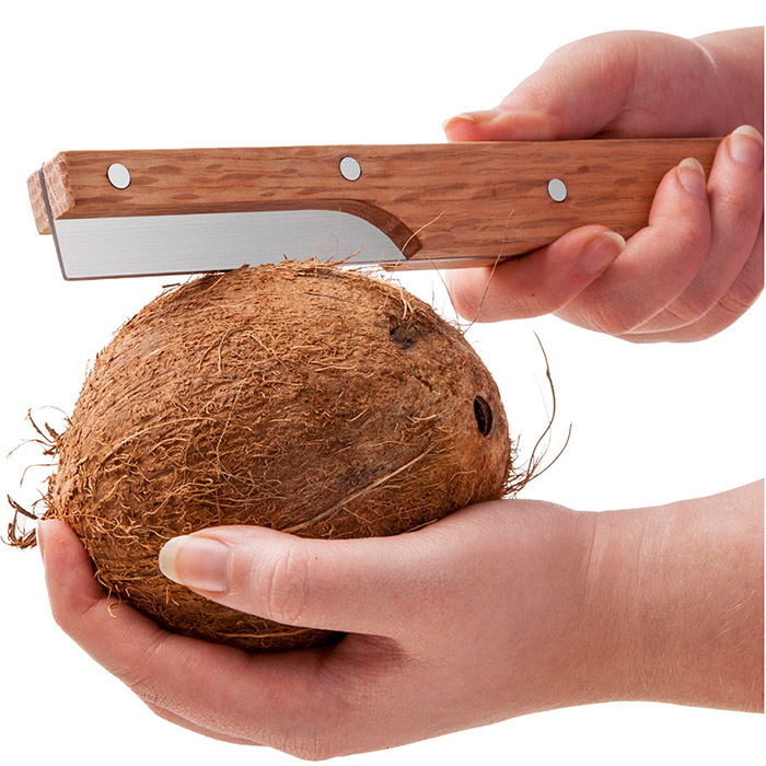 Najlepszy dostępny na naszym rynku otwieracz do kokosa. Dzięki niemu z łatwością otworzysz i przygotujesz go do spożycia. W pierwszej kolejności należy nakłuć delikatne oko orzecha i wylać z niego mleko kokosowe do szklanki. Następnie obracając kokosa w dłoni należy uderzać kilka razy w jego powierzchnię. Otwieracz z łatwością podzieli go na równe połówki i umożliwi łatwy dostęp do miąższu. Otwieracz do orzecha kokosowego należy myć wilgotną gąbką lub szmatką, aby chronić drewno, nacierać je olejem roślinnym lub oliwą z oliwek conajmniej 4 razy w roku.