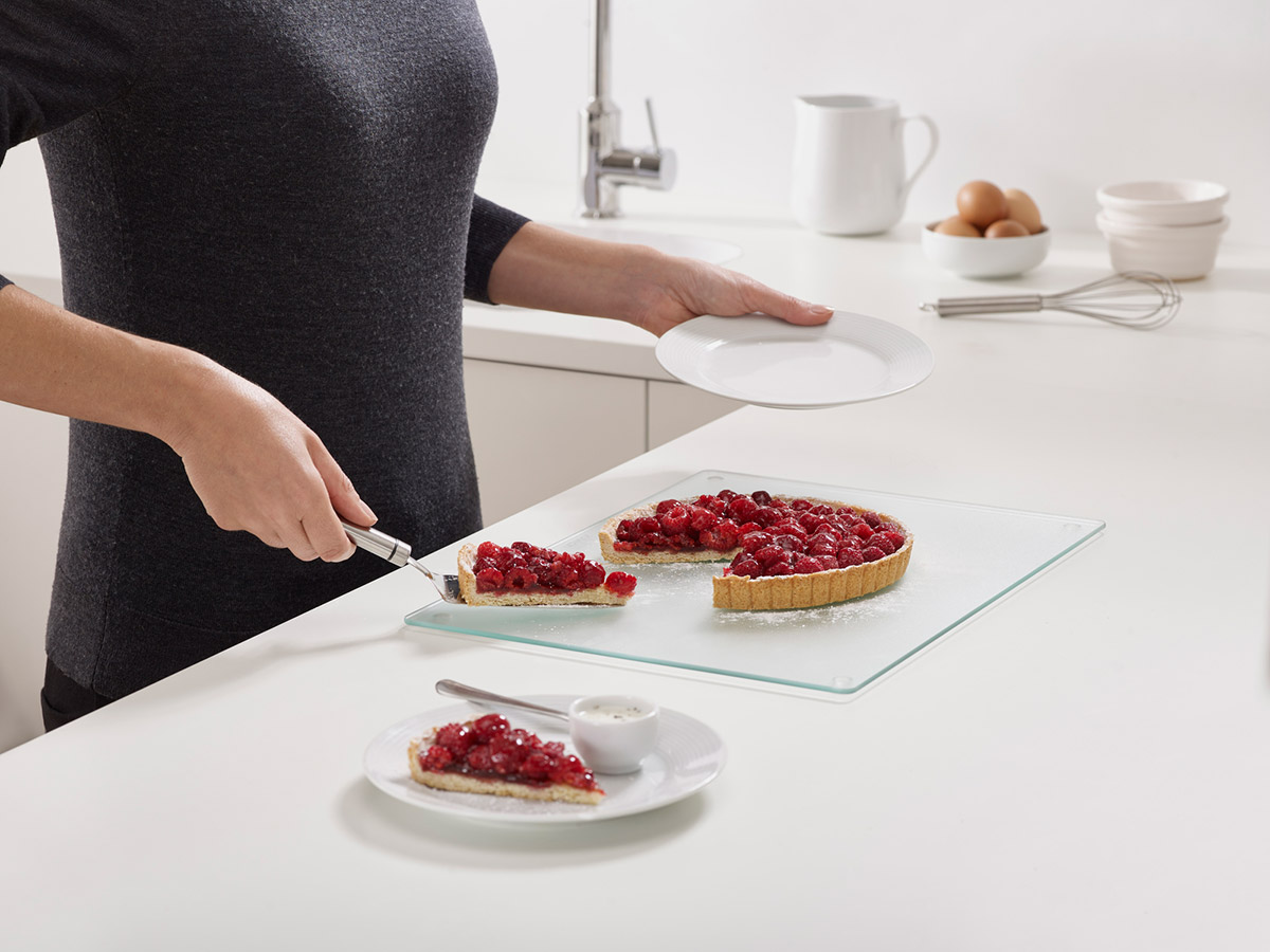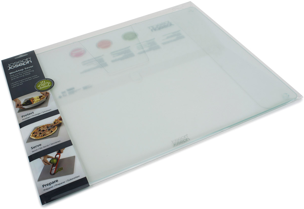 Podkładka szklana pod gorące naczynia Joseph Joseph transparentna wykonana z hartowanego szkła to doskonały dodatek do Twojej kuchni. Zastąpi tradycyjną deskę do krojenia, pomoże przy przygotowywaniu potraw, może posłużyć jako szklana deska do serwowania, dobrze będzie wyglądała jak podamy na niej sery, owoce albo wędliny. Hartowane szkło ułatwia utrzymanie w czystości dzięki czemu jest higieniczna, nie zatrzymuje żadnych barw ani zapachów. Wyposażona jest w gumowe, antypoślizgowe nóżki, które zapobiegają przesuwaniu po blacie.