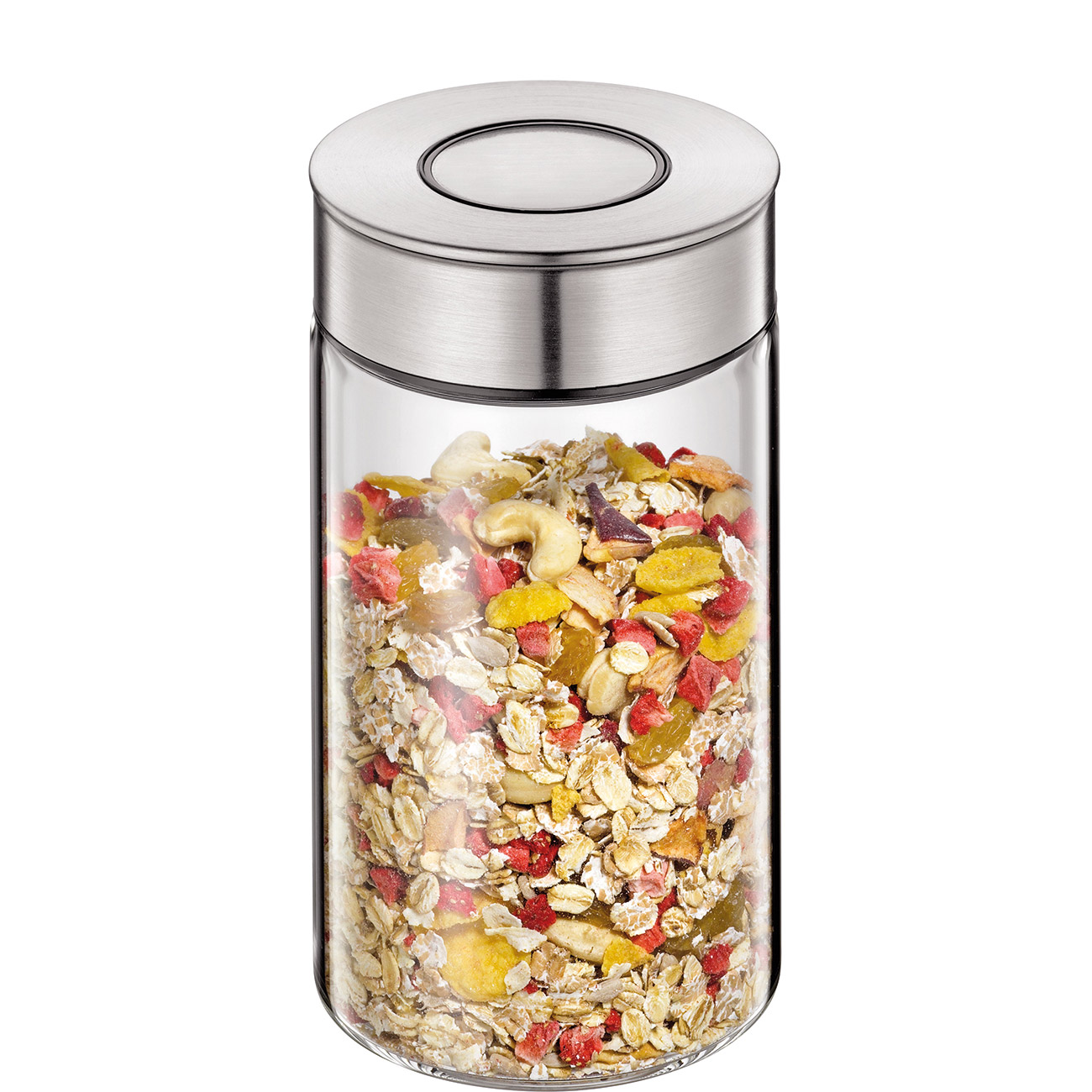 Pojemnik kuchenny 1 Litr szklany ze stalową zatyczką Vetro Cilio. Wyposażony w przycisk zaciskający uszczelkę pojemnika dla dłuższego zachowania świeżości i aromatu przechowywanej zawartości. Przejrzyste, szklane ścianki ułatwiają identyfikacji zawartości. Prosty design łączący szkło i satynową stal nierdzewną łatwo dopasuje się do każdej kuchni.