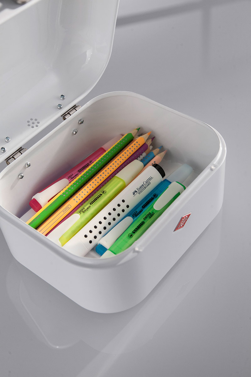 Pojemnik na drobiazgi i biżuterię miętowy Mini Grandy Wesco wyprodukowany na podstawie oryginalnego projektu Wesco z roku 1940. Najmniejszy z rodziny serii Grand, jego niewielkie wymiary z powodzeniem wystarczą na przechowanie biżuterii, kosmetyków, lekarstw czy akcesoriów do szycia lub pisania. W kuchni przyda się do przechowywania herbaty w saszetkach. W pokoju dziecięcym tworzy skrzynię ze skarbami. Nadany mu styl lat '40 XX wieku, świetnie będzie się prezentował w otoczeniu przedmiotów w styli Vintage.
