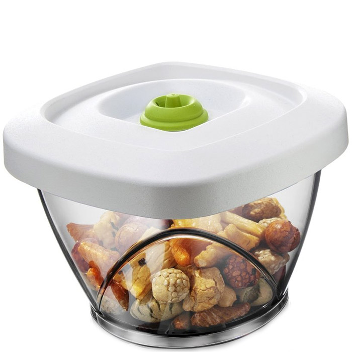 Pojemnik próżniowy Vacu Vin pojemności 650 ml, który doskonale nadaje się do przechowywania herbaty, kawy, suszonych ziół lub przypraw. Dzięki wytworzeniu podciśnienia we wnętrzu pojemnika zawartość pozostaje świeża i nie traci smaku i aromatu. Pojemnik składa się z przezroczystej miseczki i białej pokrywki z zielonym korkiem próżniowym. Sposób użycia: do pojemnika włożyć wybrany produkty, przykryć pokrywką. Przy pomocy pompki próżniowej (do nabycia osobno) usunąć powietrze, aż do usłyszenia charakterystycznego dźwięku. Aby otworzyć pojemnik wystarczy przechylić pod kątem gumową wypustkę na szczycie korka.
