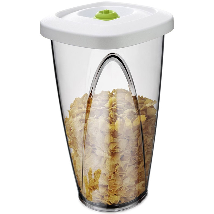 Pojemnik próżniowy Vacu Vin pojemności 1,3 Litra, który doskonale nadaje się do przechowywania płatków śniadaniowych, musli, ryżu, cukru czy ciastek. Dzięki wytworzeniu podciśnienia we wnętrzu pojemnika zawartość pozostaje świeża i nie traci smaku i aromatu. Pojemnik składa się z przezroczystej miseczki i białej pokrywki z zielonym korkiem próżniowym. Sposób użycia: do pojemnika włożyć wybrany produkty, przykryć pokrywką. Przy pomocy pompki próżniowej (do nabycia osobno) usunąć powietrze, aż do usłyszenia charakterystycznego dźwięku. Aby otworzyć pojemnik wystarczy przechylić pod kątem gumową wypustkę na szczycie korka.