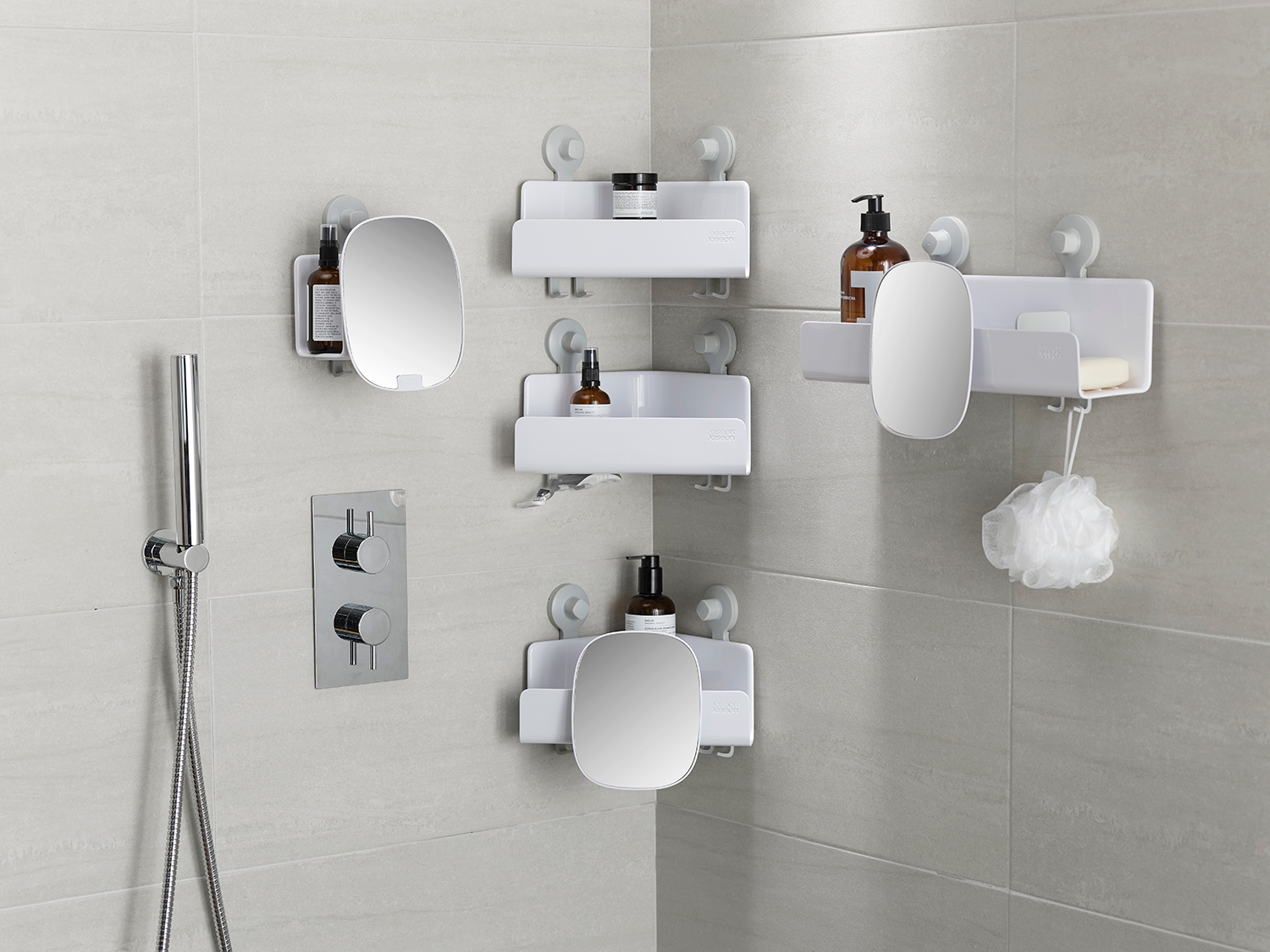 Półki narożnikowe pod prysznic EasyStore Joseph Joseph. Kompaktowe półki pod prysznic ułatwiające przechowywanie akcesoriów i kosmetyków do kąpieli. Są wystarczająco duże, aby pomieścić wszystkie niezbędne butelki z mydłem i szamponem, i mają haczyki na maszynkę do golenia, gąbki i myjki. Zalety półki: konstrukcja samoodpływowa; poręczne haczyki do przechowywania; podnoszona półka ułatwiająca czyszczenie; łatwa instalacja bez użycia narzędzi za pomocą przyssawki super-grip. Możesz je obicążyć do 2kg.