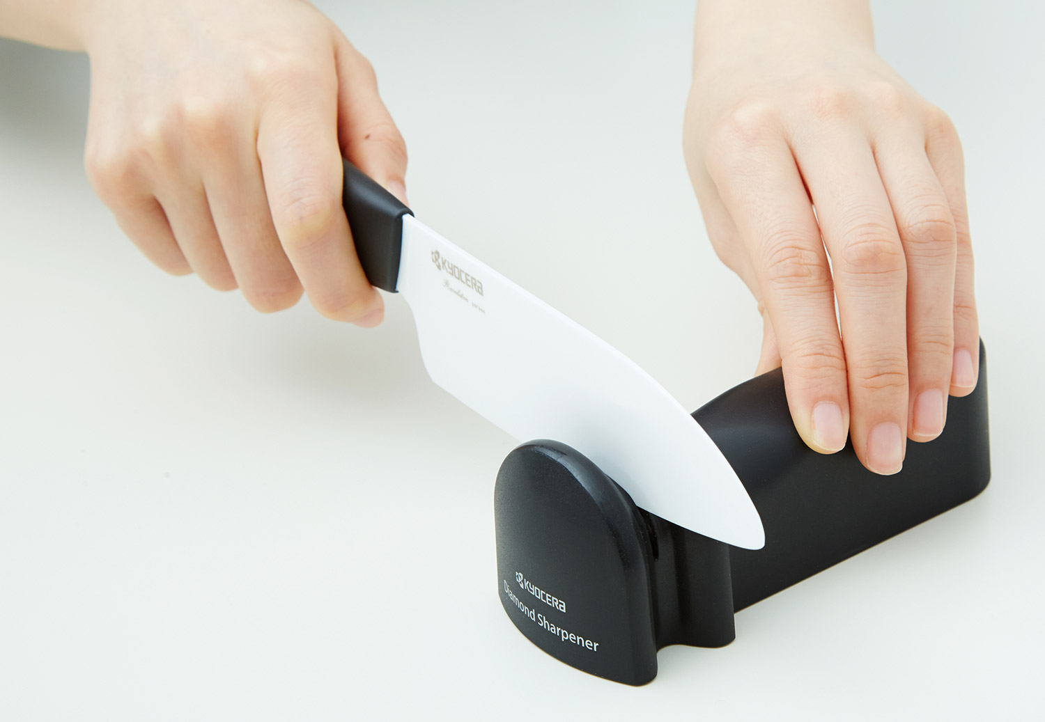 Ręczna ostrzałka do noży stalowych i ceramicznych Kyocera. Prosta, bezpieczna w użyciu i niezwykle skuteczna ostrzałka manualna, służąca do perfekcyjnego ostrzenia noży stalowych oraz ceramicznych. Opatentowany, obrotowy kamień ostrzący wykonany został z wysokiej jakości, szlachetnej ceramiki co gwarantuje doskonałe rezultaty w krótkim czasie. Kamień ma największą odporność na zużycie z dostępnych na rynku, zapewniając ostrość jak w brzytwach. Ergonomiczny uchwyt zapewnia maksymalną stabilność. Wygodny rowek prowadzący pomaga utrzymać odpowiedni 30o kąt ostrzenia. W celu usunięcia resztek pyłu wytwarzanego podczas ostrzenia, należy przepłukać ostrzałkę pod bieżącą wodą.