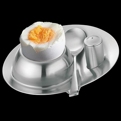 Wykonany ze stali nierdzewnej zestaw do podawania jajek na miękko. W skład wchodzi podstawka na jajko, solniczka i łyżeczka.